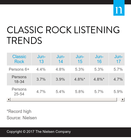 Guest post by Fred Jacobs of Jacobs MediaI’ve been fielding questions about the “Classic Rock Death Star” for more than 30 years now. From the format’s beginnings, naysayers have been convinced that fatigue and repetition would ultimately deep-six these rockin’ gold based stations.But that hasn’t been the case – in fact, not even close. The format has actually thrived in the PPM era, often scoring record ratings for stations that execute it well. I probably get to see more music and perceptual research for Classic Hits/Rock stations. And I can tell you without qualification, the state of the format is:As strong as everEvery June, Nielsen publishes a scorecard for the format. And a remarkable trend has begun to manifest itself. True, station after station in market after market are knocking down strong ratings. And the trend line is very positive – even among 18-34 year-olds – a demographic group that no one would have predicted would be part of the format’s story in 2018 (including me):We’ll have to wait and see how June 2018 ends up. But whether you’re looking at mass appeal numbers like 6+, the 25-54 sweet spot, or those 18-34 members of Gens Z and Y, the story is impressive.All of this hit home earlier this week when it was brought to my attention the hashtag #MillennialClassicRock was trending. It’s a wonderful example of social media humor based around the lyrics of big Classic Hits and Rock songs. And while many of these Twitter “content creators” are probably outside the Millennial boundaries, the humor, the irony, and the generational snark is LOL-worthy:And it tells you that aside from the music’s sustained popularity – on the radio, in movie soundtracks, on video games, and in television ads – it has also become a fixture in our entertainment culture.So, what’s the problem?It turns out a new book – “Twilight of the Gods” by Steven Hyden – talks about the end of the line for many Classic Rockers due to advancing age and other health issues that impact all of us eventually – even the most iconic rock stars.Author Hyden is a living, breathing example of why the Classic Rock format is alive, well, and thriving. He’s a Gen X dyed-in-the-wool uber P1 to the music. He’s a loyal super fan, not the least reluctant to write about his worship of the music and the brilliant artists who wrote and performed it – and in many cases, still playing concerts today.That’s where he begrudgingly admits the reality of Father Time, expressing a sense of melancholy and even regret when he saw the Who perform live in 2012, and came to the realization the band was succumbing to advancing age.Incidentally, I’ve had that same personal reaction to seeing my favorite bands from the ’60s and ’70s lose their fastball right on stage in front of thousands. The Who’s Super Bowl performance in 2010 was that moment for me. I’ve gotten to the point where I won’t go to concerts from certain Classic Rock bands because I’d rather remember them as they were.Hyden was recently interviewed by The New York Times‘ John Williams, and left us with some incredible nuggets that eloquently explain the lasting power of the radio format:“Because of the nature of Classic Rock radio playing these songs over and over gain, these artists are frozen in amber in a certain way.”“The connection I have to this kind of music is the closest thing I have to religion – which is a very Classic Rock thing to say, a very over-the-top, bombastic statement.”“When people mourn pop stars, what they’re really mourning is a piece of their own past.”“Before Classic Rock radio, you were on the radio because you had hits, and once you didn’t have hits, you were gone. Classic Rock introduced this idea that you could stay on the radio forever without having any new songs. It created this situation where classic bands were competing with new bands. It was like rock history being split in two.”Despite the brilliance of these observations, Times writer Wiliams avers the genre “is in steep decline.” But music history – now spanning centuries – suggests he may be seriously mistaken. In the interview, Hyden talks about how bands that have survived the loss of key members have persevered, often “melting together” to continue touring.Think about AC/DC who replaced their lead singer, Brian Johnson (who replaced Bon Scott), with Axl Rose of Guns N’ Roses.Then there’s the “keeping it in the family” strategy. Bruce Springsteen somehow replaced his late band mate – Clarence Clemons – with the saxophonist icon’s nephew, Jake (pictured right). And Wolfgang Van Halen – Eddie’s son – is now playing bass in place of original band member Michael Anthony.In an interesting generational twist, Ringo’s son, Zack Starkey, took over for the Who’s Keith Moon many years ago.And mixing genres, Country star Vince Gill is now sitting in for the late Glenn Frey, co-founder of the Eagles. And interestingly, so is Frey’s son, Deacon.But none of these slick substitutions explains the hundreds of “tribute bands” touring the country and the world, brilliantly carbon-copying the music, outfits, style, and vibe of the legendary Classic Rock bands they celebrate.Talk to fans of these skilled “tribute bands” like Australian Pink Floyd or 1964 (the Beatles) at their concerts, and you’ll hear some of the same oozing, unabashed passion Classic Rocker fans had for the original performers decades ago. Whether you’re old enough to have grown up with the music – or you wished you had – it’s still very much possible to enjoy the musical sounds of generations past.And there’s precedence for this. Symphony orchestras have been successfully “covering” Tchaikovsky, Mozart, Wagner, Brahms, and the scores of other long-dead Classical music composers and performers for years and years.That’s right – think of the New York Philharmonic or the Detroit Symph