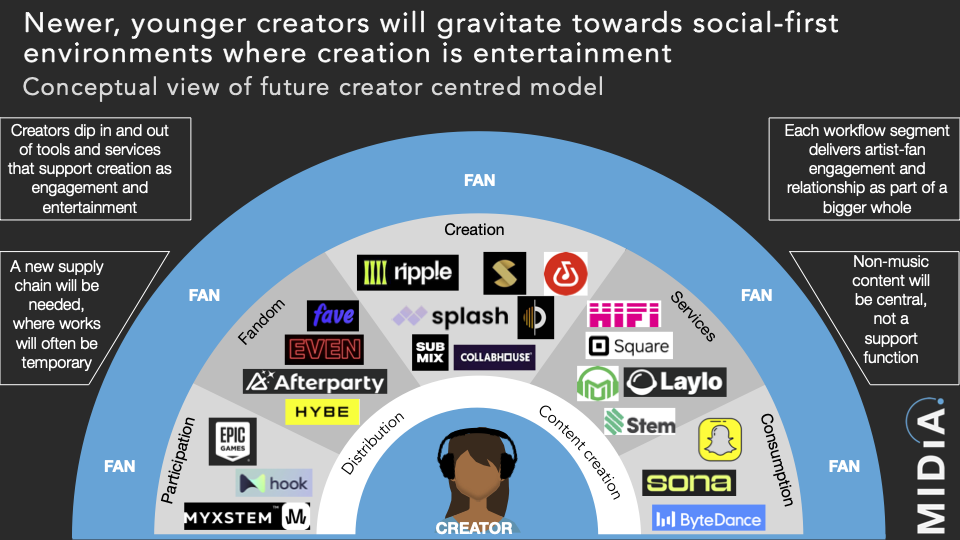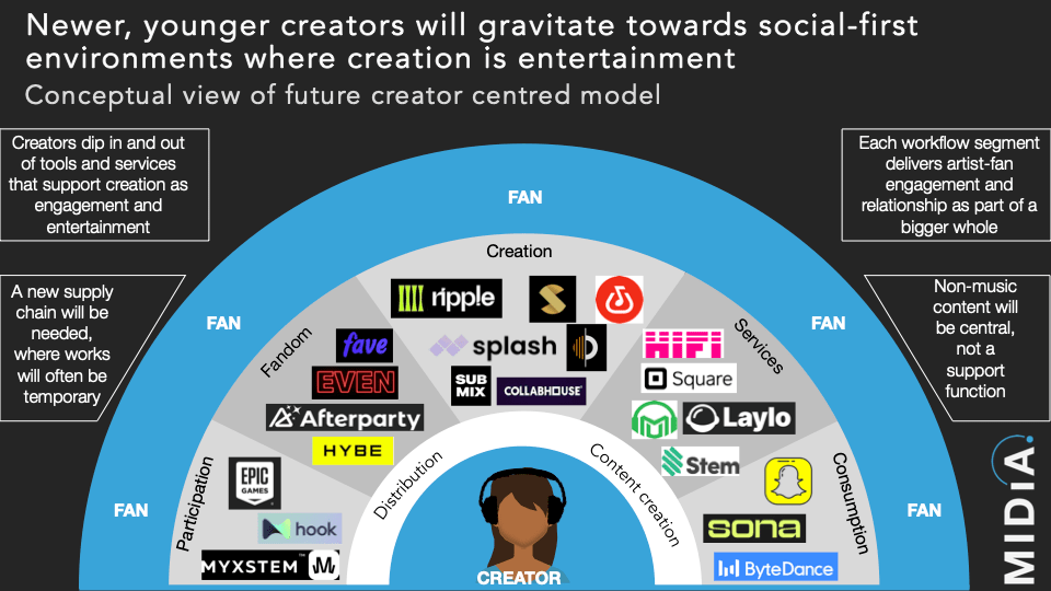 But it is post-pandemic trends that will grow the market most: a) the rapid rise of AI, and B) the rise of the consumer-creator. Consumer-creators transformed photography (Instagram) and videography (TikTok); music will be next. Not only will casual music creation become mainstream, it will trigger an unprecedented widening of the music creator economy funnel. So the market’s future will be defined by:
