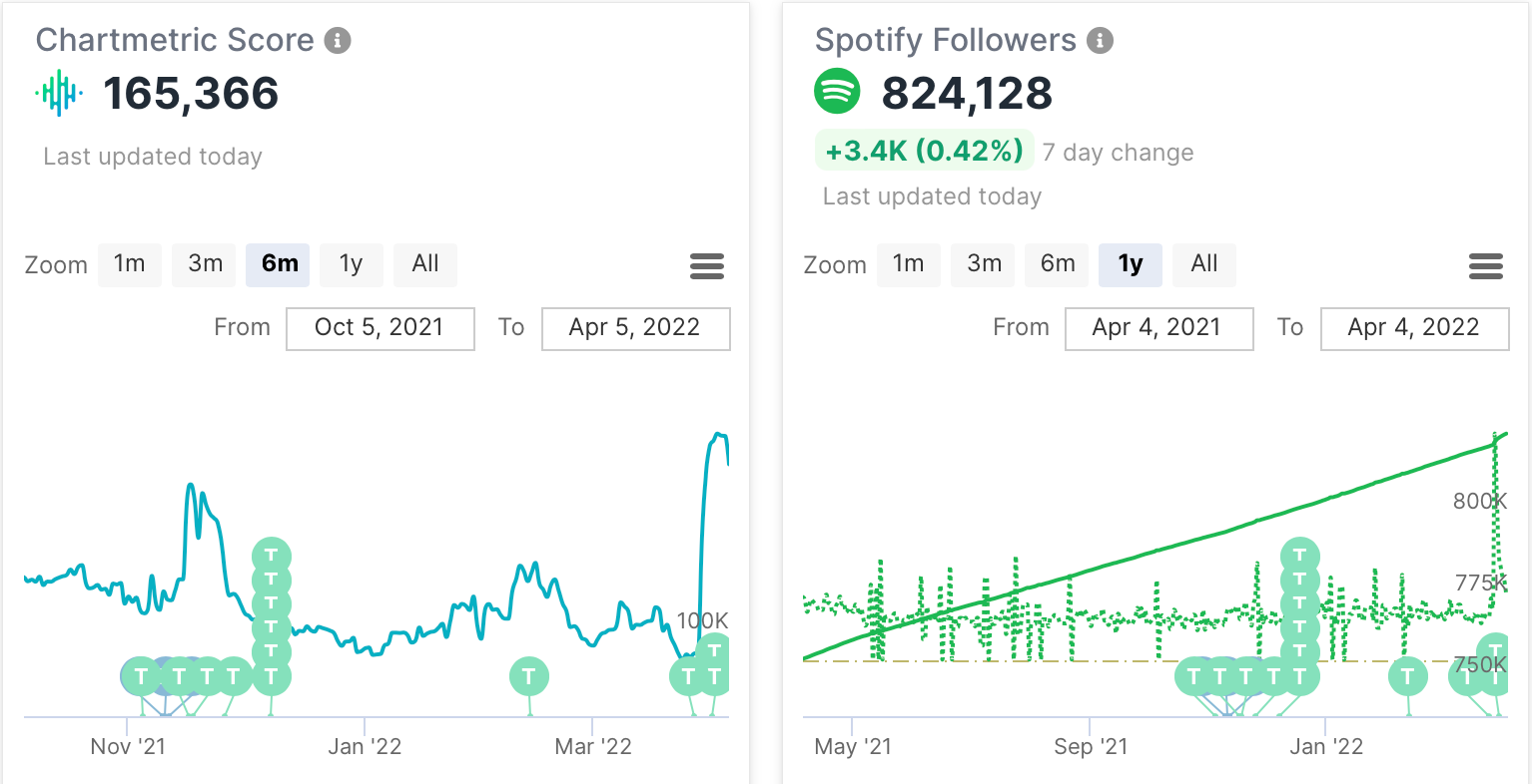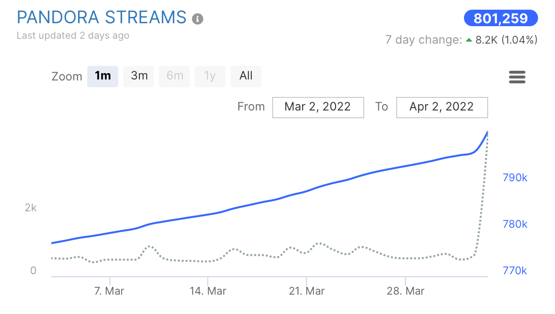 While the Grammys ceremony wasn’t fully without controversy, nothing rose to the level of slapgate infamy, and that’s largely reflected in the data (0r lack thereof) for artists who were nominated, won, or performed at the awards show. Olivia Rodrigo, who fits all three of those categories, saw negligible Spotify growth, for instance, and her Chartmetric Artist Score just shot back to where it was a month before.
