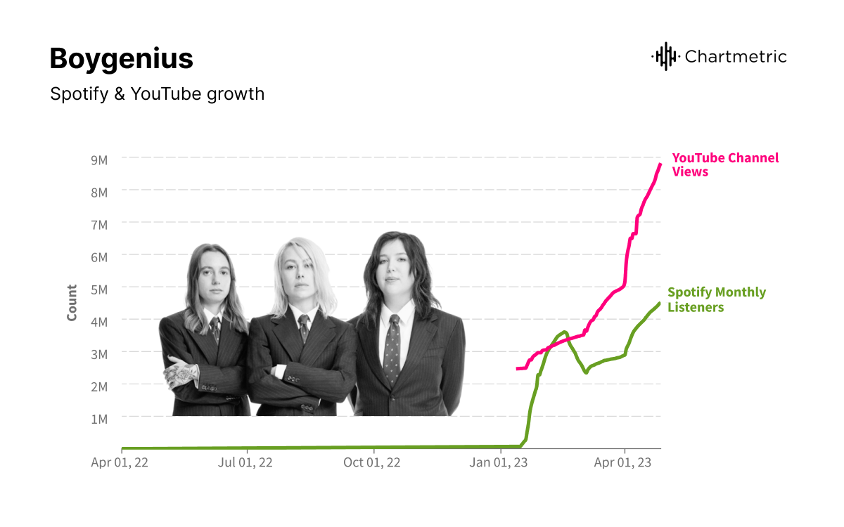 Boygenius, the indie folk supergroup of Phoebe Bridgers, Lucy Dacus, and Julien Baker, already had a burgeoning following when they released their debut self-titled EP in 2018. But when they released their first full-length, The Record, this March, it was to a considerably wider audience. The trio had already landed the cover of Rolling Stone and announced a stadium tour when the new LP was met with critical acclaim, as well as a co-sign from Taylor Swift who called it “genuinely a masterpiece.” It also led to the group jumping from 67K to 3.93M Spotify monthly listeners across the year. But this time, the new material also landed in a new landscape of emerging singer-songwriters who seemed to have absorbed elements of the Boygenius sound in their own work.