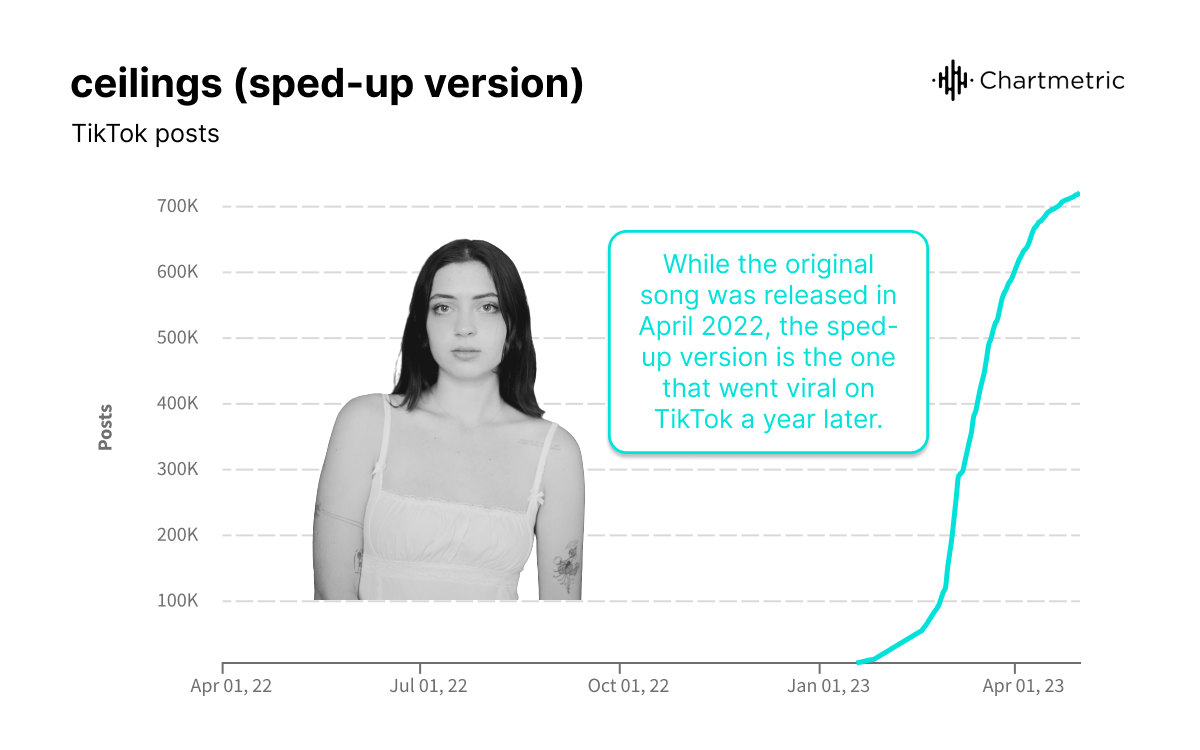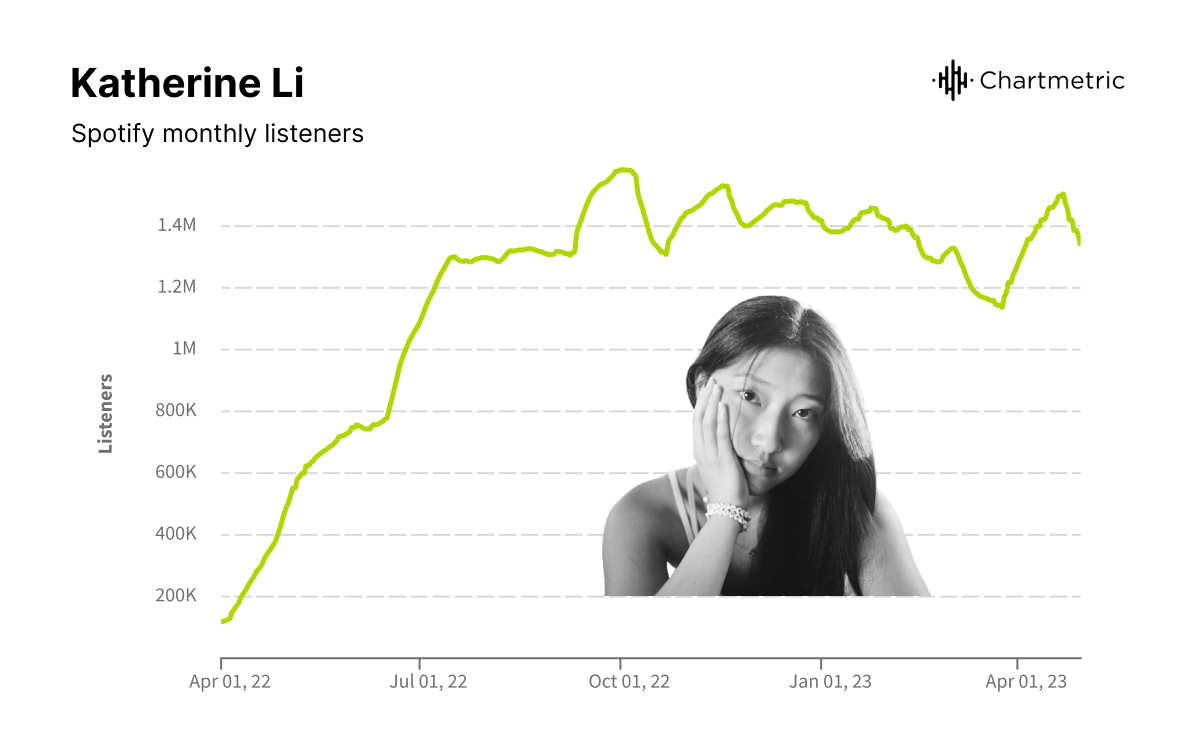 Yet Li’s big hit came a few months later with “Never Had a Chance,” whose teaser has now garnered 2.8M TikTok views. The purposefully unguarded clip, which sees her sullenly playing the song on a keyboard while wearing no makeup and sitting on the floor in sweatpants, makes her confessional lyrics seem even more personal to viewers. Since the track came out in April 2022, it’s collected 22.6M Spotify streams, resulted in 1.4M TikTok videos, and got a placement in Spotify’s “Songs That Made Us Cry in 2022” playlist (165K followers). Since then, she shared her debut EP, crush(ed), in October and another recent single. In just a year with no label, she’s gained 1.4M Spotify monthly listeners and a slot opening for Hayley Kiyoko this spring.