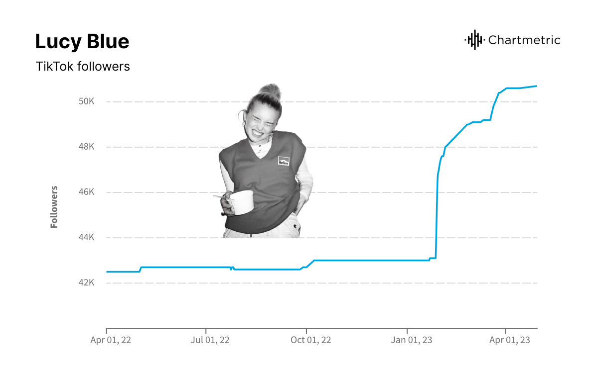 While McAlpine and Li have scored the biggest folk-pop smashes through TikTok, there are a host of other emerging artists who have dabbled in the Boygenius sound and are bubbling up on the app. There’s the Dublin-based 19-year-old Lucy Blue (50.6K TikTok followers), whose recent folk-pop single “I Left My Heart,” on which she reminisces about her “dirty old town” over acoustic guitar and piano, has gained 142K Spotify streams in a month.