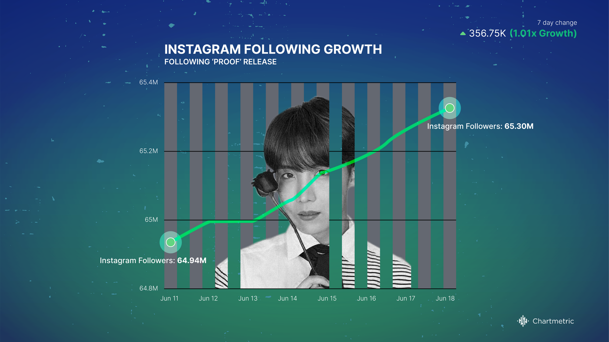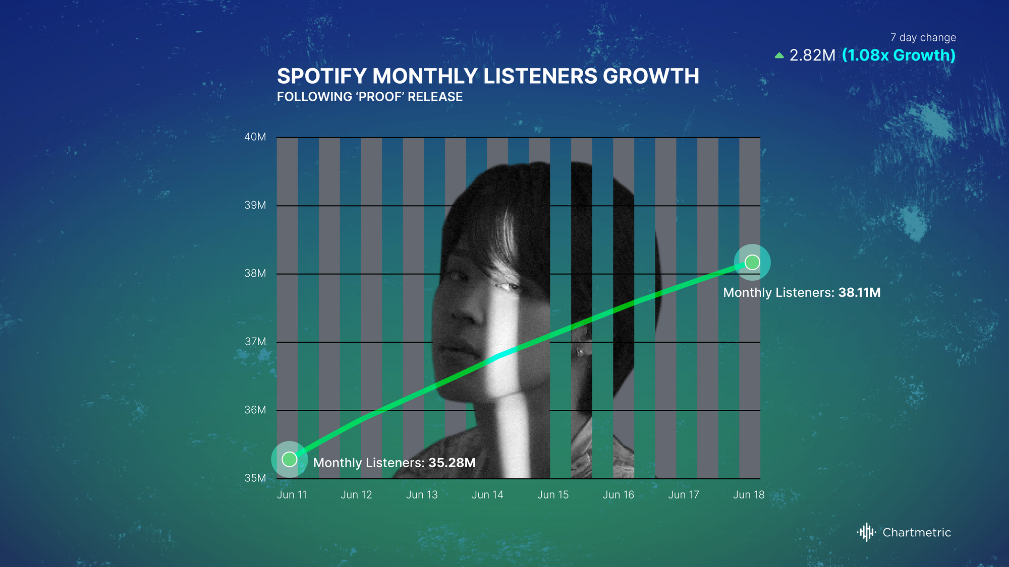 On Friday, June 10, three days before the announcement, BTS released a three-disc anthology album, Proof, featuring hit songs, new tracks, and an exclusive disc that can only be heard through a physical purchase. Quickly, the band found themselves at No. 1 on Billboard’s Global Excluding U.S. chart with the track “Yet To Come” receiving 96.5M streams and 42K sales in territories outside of the United States. Proof also premiered at No. 1 on the U.S. Billboard 100, lifting BTS to the Artist 100 No. 1 spot. In just a week’s time, the group increased their Spotify Monthly Listeners by 2.8M, their Instagram following by 356.8K, and their YouTube channel views by 248.2M.