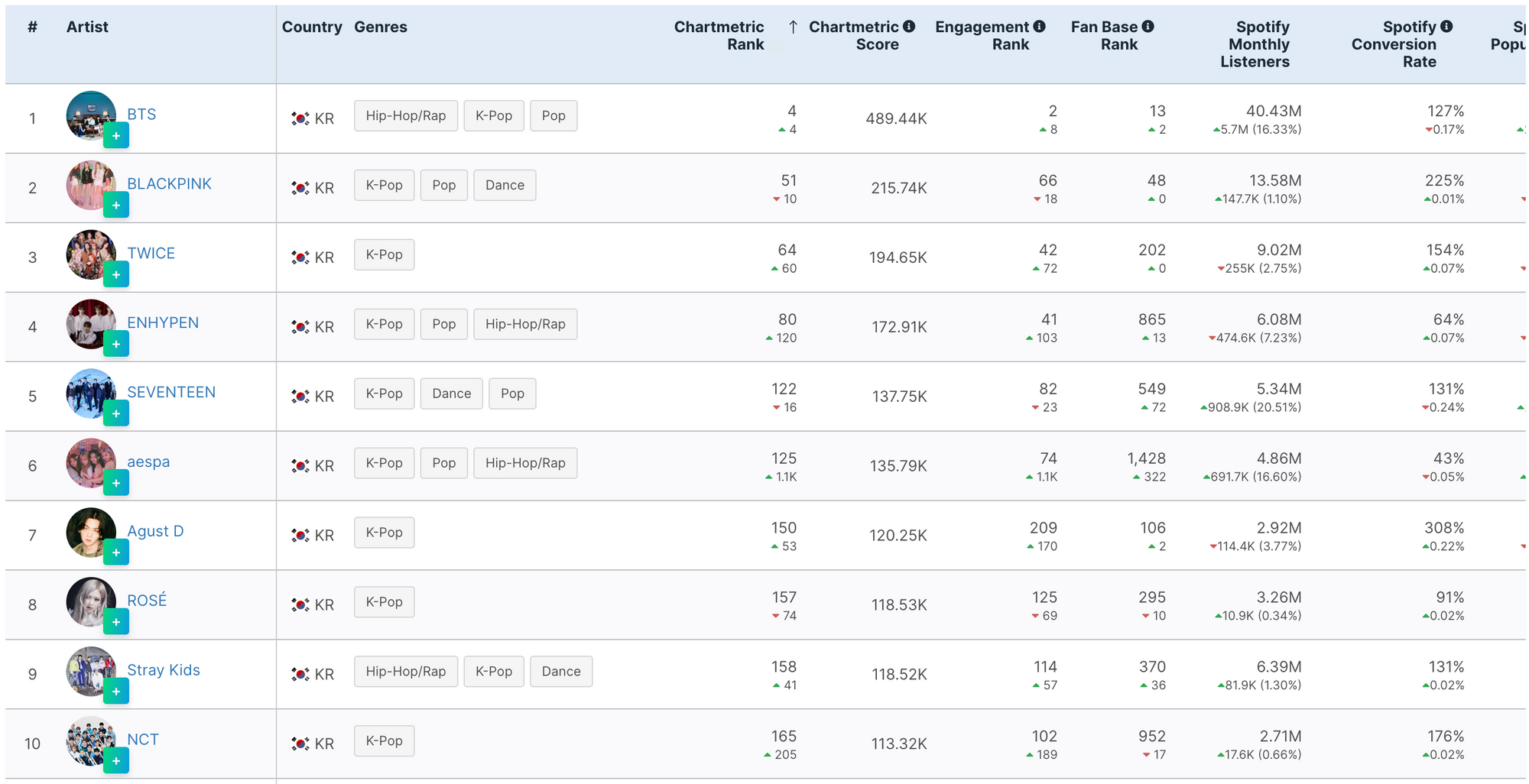 Note: Chartmetric Artist Rank is based on Chartmetric Artist Score, which captures an artist’s overall performance across 16 social and streaming platforms through a weighted average. This score can rise as an artist builds their fanbase and increases engagement with their audience. An artist’s Chartmetric Artist Rank, as a result, is determined by comparing their score to that of millions of other artists in our database every day.