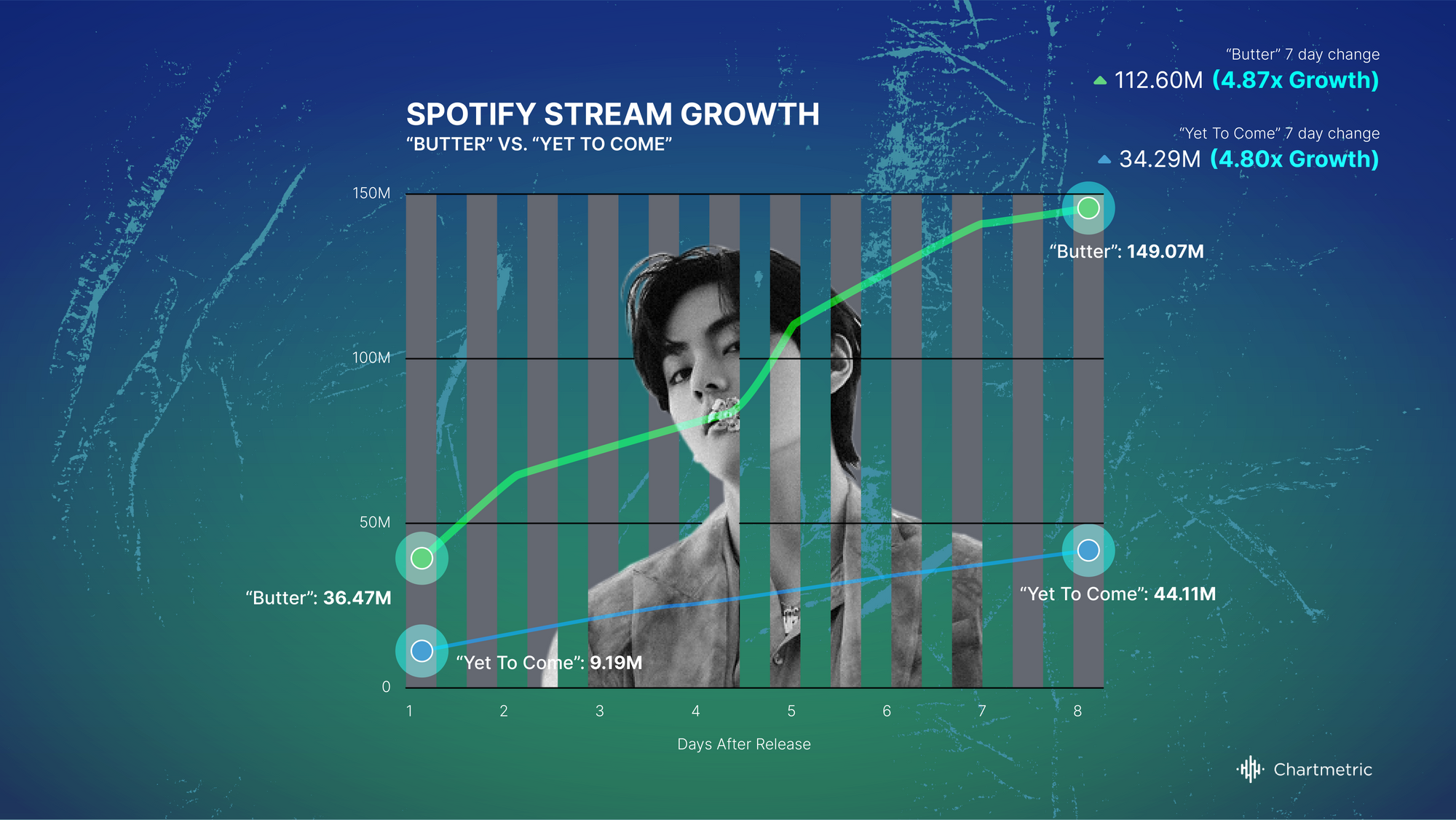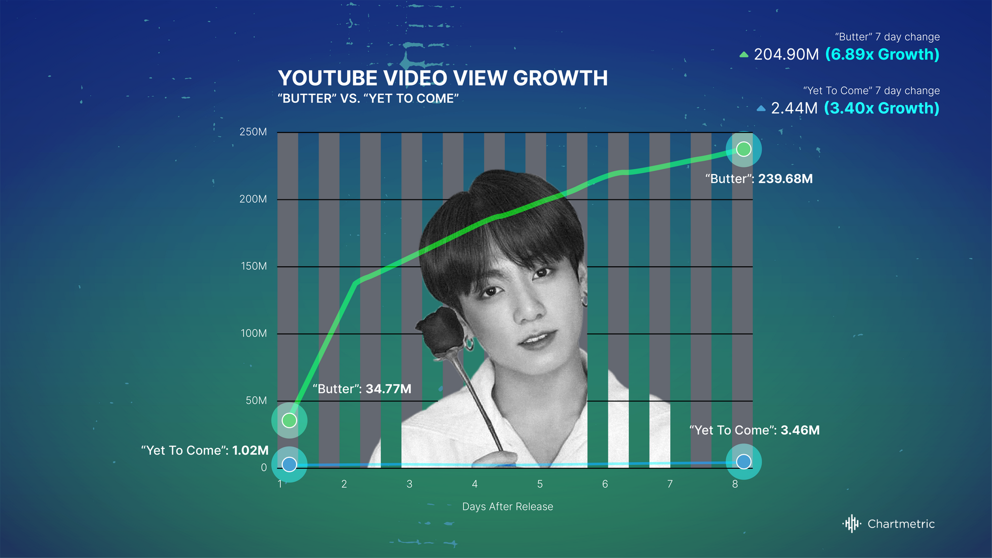 With all the excess press and media surrounding the hiatus, we were curious to see if there was any impact on engagement regarding the recent album release. To test the question, we’ve analyzed how Proof’s hit track “Yet To Come” compares to the release of “Butter,” a No. 1 hit that broke the record for the largest YouTube debut premiere of all time. In terms of the album’s performance, we also compared Proofwith three previous BTS hits to consider how it performed in terms of overall listener growth.
