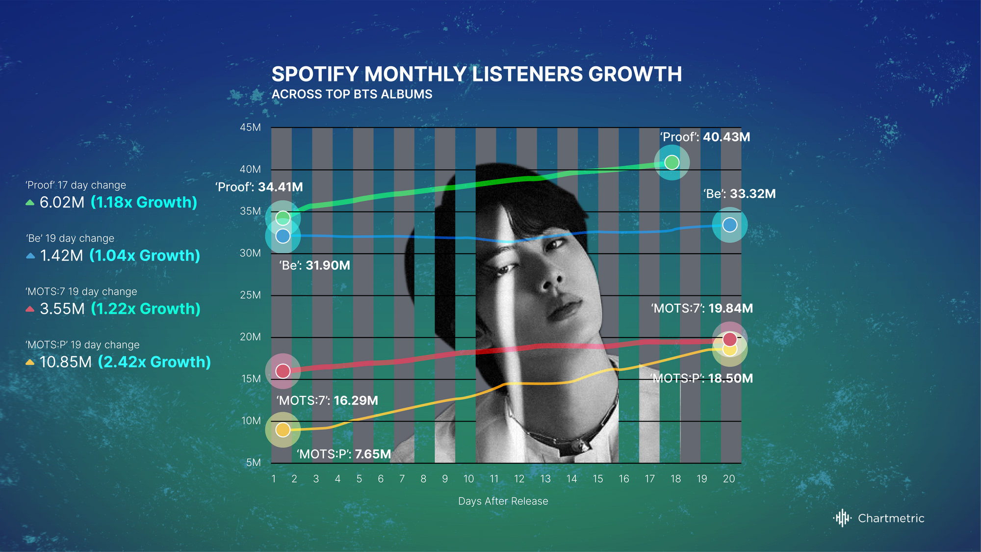 Interestingly, “Yet To Come” actually falls short when pitted against “Butter,” receiving nearly a third fewer Spotify streams and not even coming close in terms of YouTube views in the week after release. One reason for this may be because “Butter” was a standalone single, while “Yet To Come” was released with the entire Proof project. That being said, Proof actually stands at second place in terms of growing listener engagement as opposed to best sellers Map of the Soul: 7, Map of the Soul: Persona, and Be. In just 19 days after release, Proof increased BTS’ Spotify Monthly Listeners by 6.02M (1.18x growth), while MOTS: Persona increased the same stat by a whopping 11M (2.42x growth), MOTS: 7 by 3.5M (1.22x growth), and Be by 1.42M (1.04x growth).
