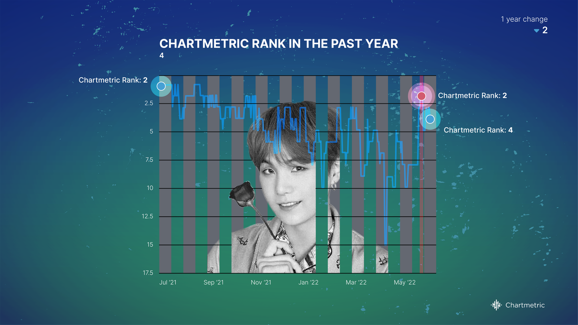 In terms of Chartmetric Artist Rank, BTS had been declining for about a year, and by declining we really mean from No. 2 to a low of No. 15 — so still the top of the top worldwide. However, on June 14 they rose back to a No. 2 spot for the first time since summer 2021.