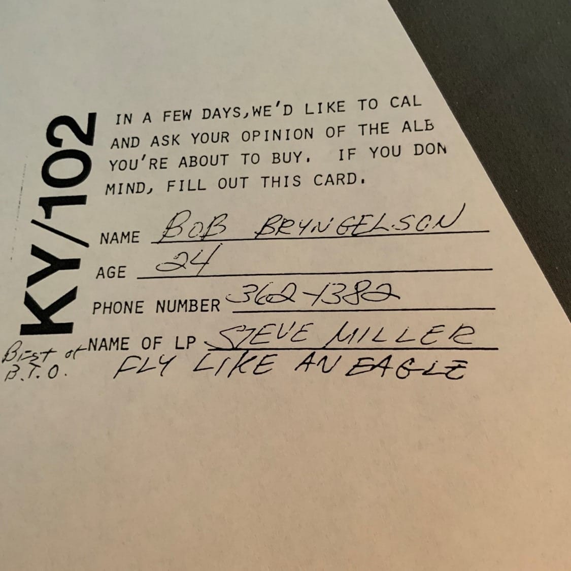 He placed simple cards in record stores in his client markets like the one you see below. Every time someone bought an album, they were asked to fill one of them out.