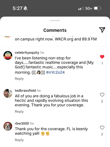 Not surprisingly, the Pulitzer Prize Board (located at Columbia) commented on the courageous WKCR team, noting they “worked to document a major national news event under difficult and dangerous circumstances and at risk of arrest.” These are heady times for these budding radio journalists, suddenly pressed into the lineup by circumstance, opportunity, and meeting the moment.