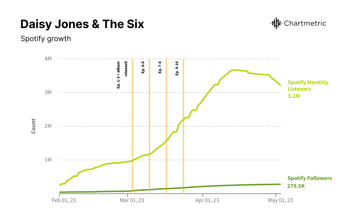 There is also the star power of the band itself, which allowed for consistent growth and potential virality: when model-actor Suki Waterhouse, who portrayed keyboardist Karen Sirko, posted the song on TikTok, it racked up over 1.8 million views. Celebrity influence is felt behind the scenes as well: Reese Witherspoon’s media company Hello Sunshine produced the series, and another 1.8 million people have seen her tease of the song. In that regard, the audience for Daisy Jones & the Six is much broader than that of a new act—their very specific media rollouts targeted fans of the book, fans of the actors, and fans of musical adaptations of books–a pool much larger than a real new band’s listenership.