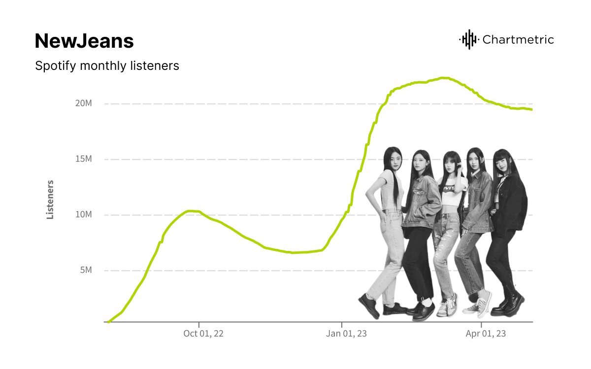 Take, for example, the brand-new K-pop girl group NewJeans. They debuted in August 2022 with immediate explosive growth but soon after, their listenership declined as they had no new releases for five months. It wasn’t until the release of their single album OMG in January 2023 that the band experience explosive growth once again and reached an all-time high of 22M+ Spotify monthly listeners the following month.