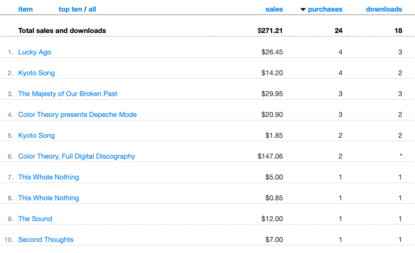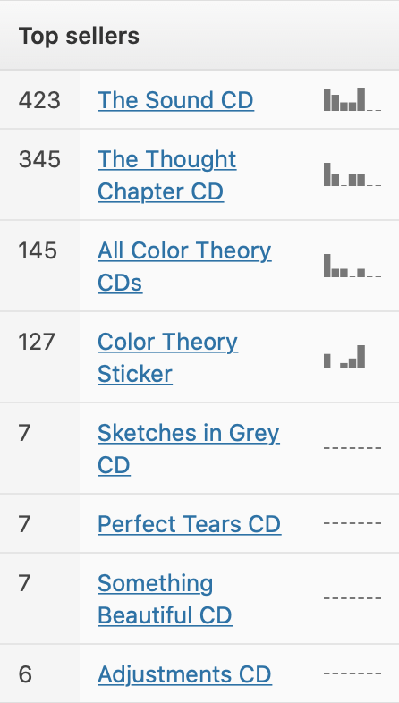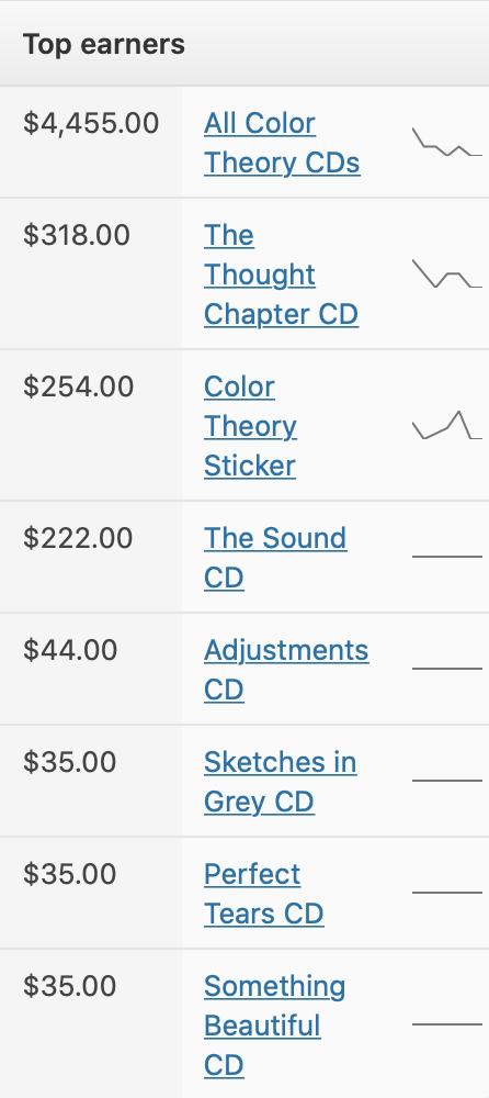 As you can see, the “All Color Theory CDs” bundle is the big money-maker. It started at $40 for 8 CDs and dropped $5 as each title sold out, ending at $25 for 5 CDs.