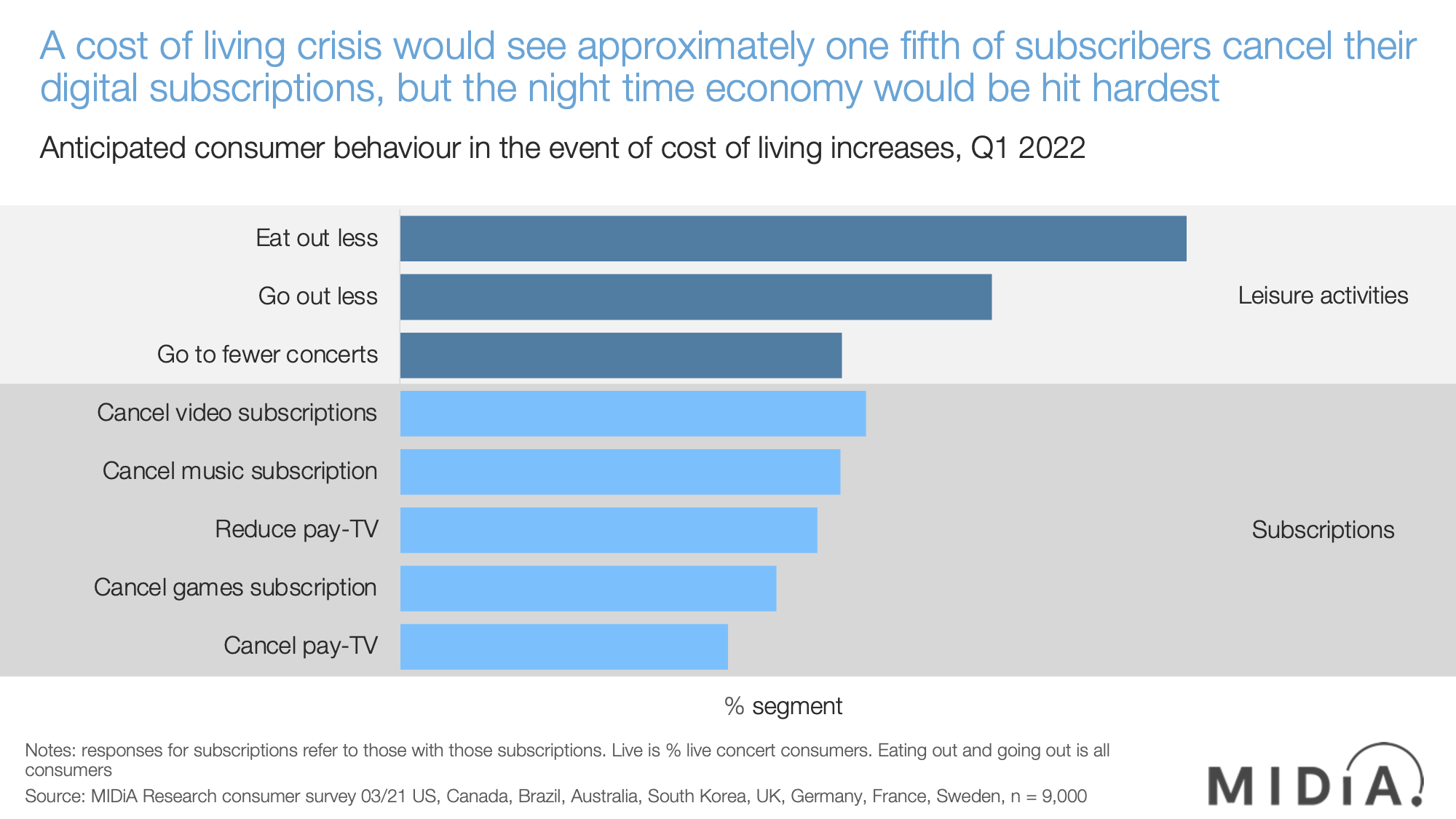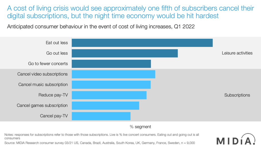 Back in late 2019 when it looked like the world might be entering a recession, MIDiA asked consumers about how they expected to change their entertainment behaviors and spending if they found themselves facing financial pressures. Now, more than two years later, as the world faces a cost of living crisis, we asked almost exactly the same questions once again. Even though the already-present cost of living crisis is far more tangible to most consumers than a potential financial recession, broadly speaking, consumers are less concerned now than they were in 2019. Whether that is misplaced optimism is another thing entirely…