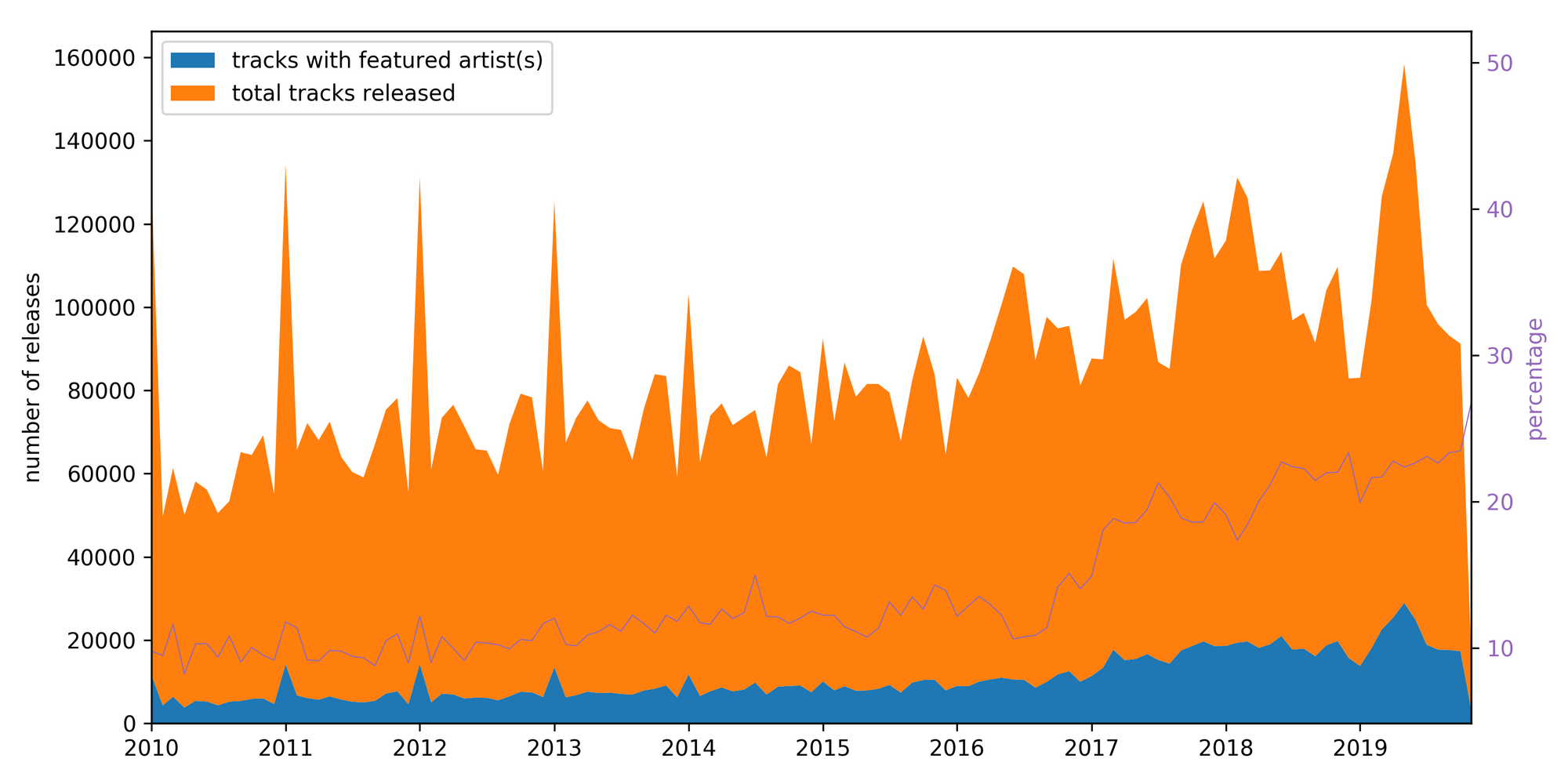 By analyzing the whole dataset, we observed that the CAI has doubled in the past decade, with most of the increase happening in the last three years, as evidenced in the chart below. The purple line means the CAI, and the blue area shows the number of tracks with two or more artists, and the orange area shows the total number of tracks released each month.
