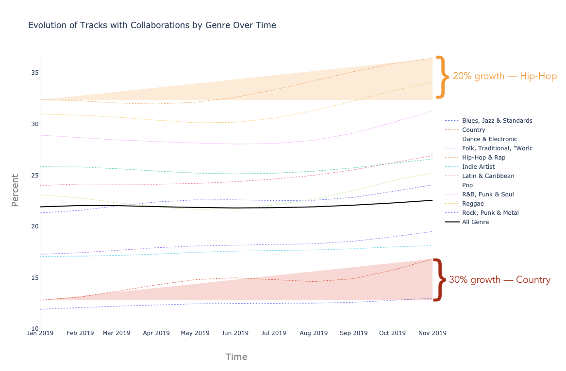 An interesting thing to note is that some genres stayed above the market line (percentage of collaboration across all genres), some stayed below, and some surpassed it. But regardless of the genres’ relative positions to the entire market, the upward trends are universal.