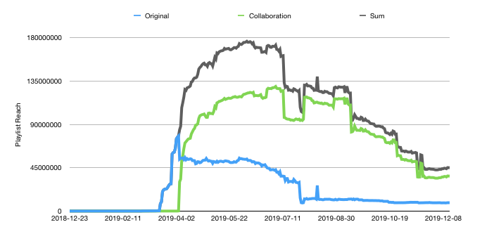 So what’s the benefit of collaboration in this case? First, a cross-genre collaboration, in general, lets an artist reach a wider audience. Second, a less obvious benefit is that it can potentially help prolong success. Take a look at the playlist evolution plot below. This plot shows the “playlist reach” (sum of the number of followers of playlists that contain this track) for both versions over time. After the spike in late March, the original version kept dropping in playlist reach. Notice that the original version, though a sensational success, peaked at half the playlist reach peak of the collaborated version.
