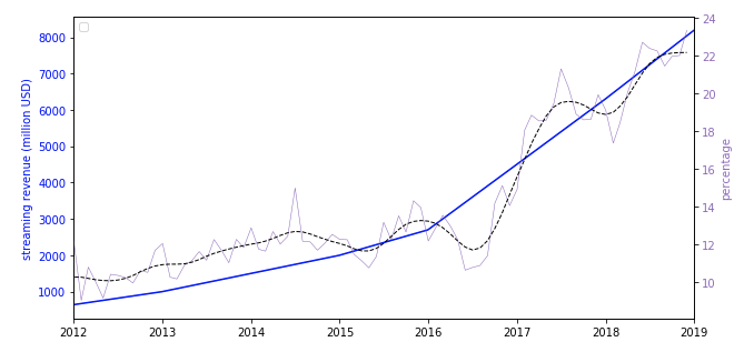 In the chart below, the blue line represents streaming revenue in the last seven years, and the purple line shows collaboration percentage. Notice the surprising correlation between the two.