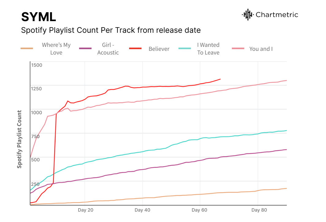“One thing that we’ve realized is that there are different kinds of segments of SYML’s audience. So you’ve got the people from the beginning with Teen Wolf, who are the diehard fans engaging with all of his content. But then we also have found a niche set of fans that are really into his instrumental and piano music, and so we’ll cater a specific marketing strategy towards them as well. And even then, since TikTok has become a bigger thing, we’ve also had a couple of moments where we’ve seen a new generation of fans come from that platform,” Emma Bleakley, Director of Analytics at Nettwerk, told Chartmetric.