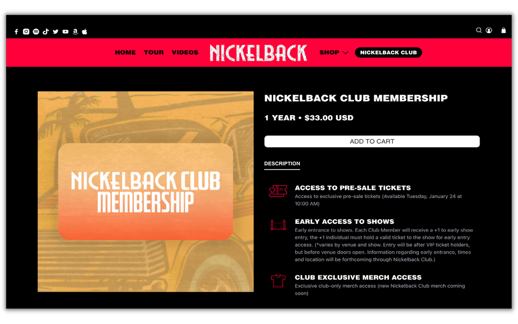 For Nickelback, the team chose to brand their Membership as the Nickelback Club. For $33, fans would become a member and get perks like: