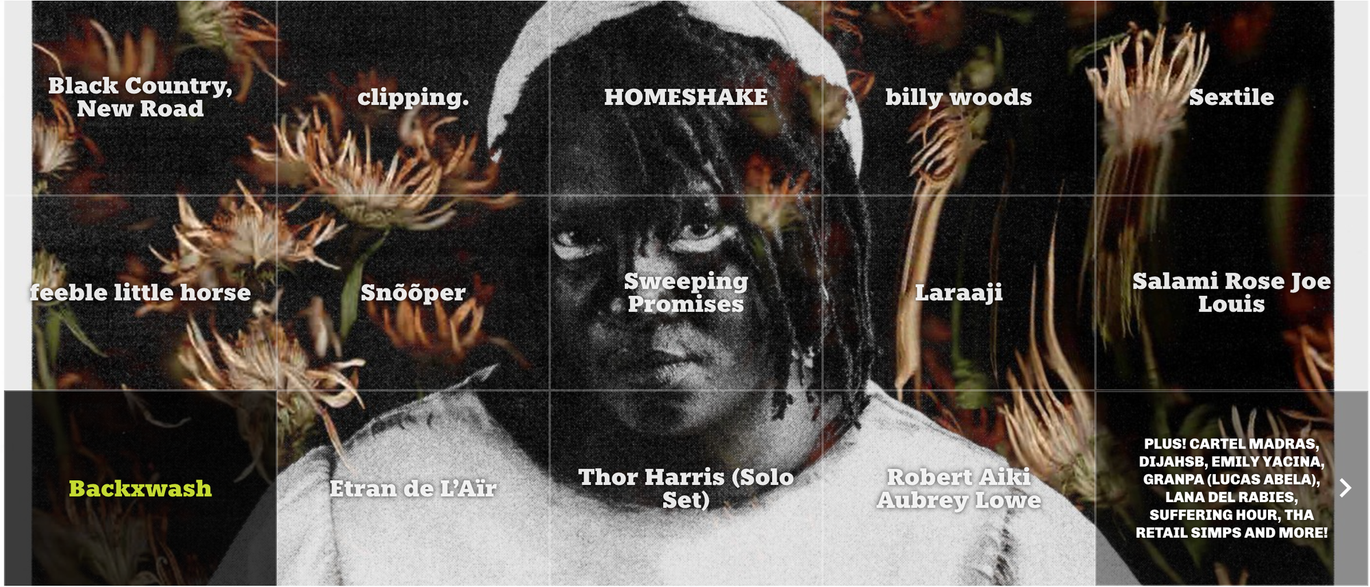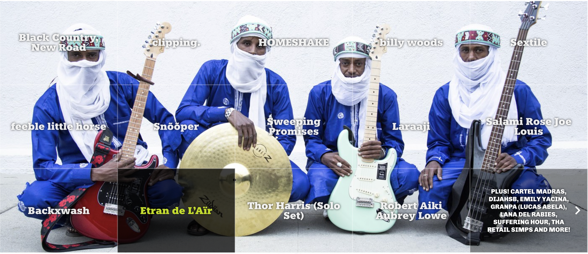 This year, the festival's lineup of 200+ bands and artists will include: the previously announced guest curator, clipping., English chamber folk ensemble Black Country, New Road, revered Canadian pop artist HOMESHAKE, LA synth punks Sextile, fuzzy indie rock outfit feeble little horse, outlandish punkers Snõõper, post-punk duo Sweeping Promises, ambient pioneer Laraaji, and Nigerian desert rock band Etran de L’Aïr.