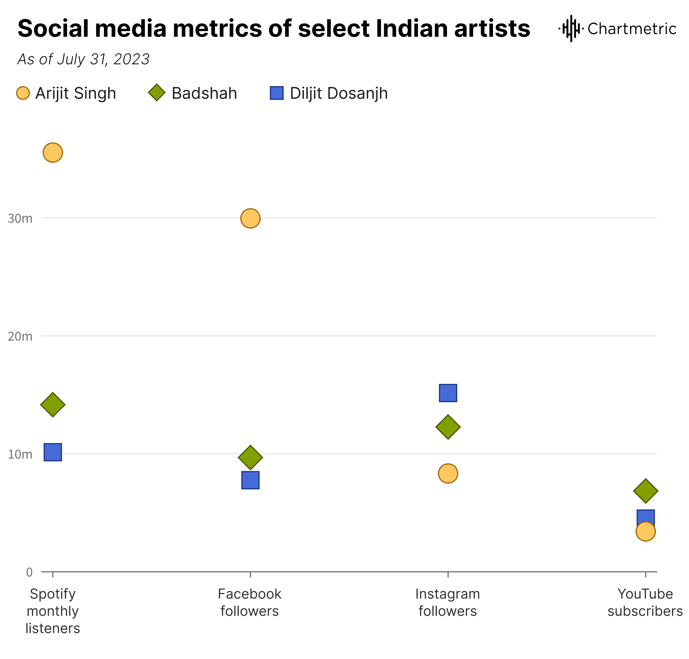 Arijit Singh is one of the most popular Bollywood singers in recent history and his impressive metrics make that clear. Globally, he has the third most Spotify followers (84.9 million) the third highest monthly view count on YouTube (1.1 billion), and with a Chartmetric rank of 40, is the second most successful artist from all of Asia (behind only BTS).