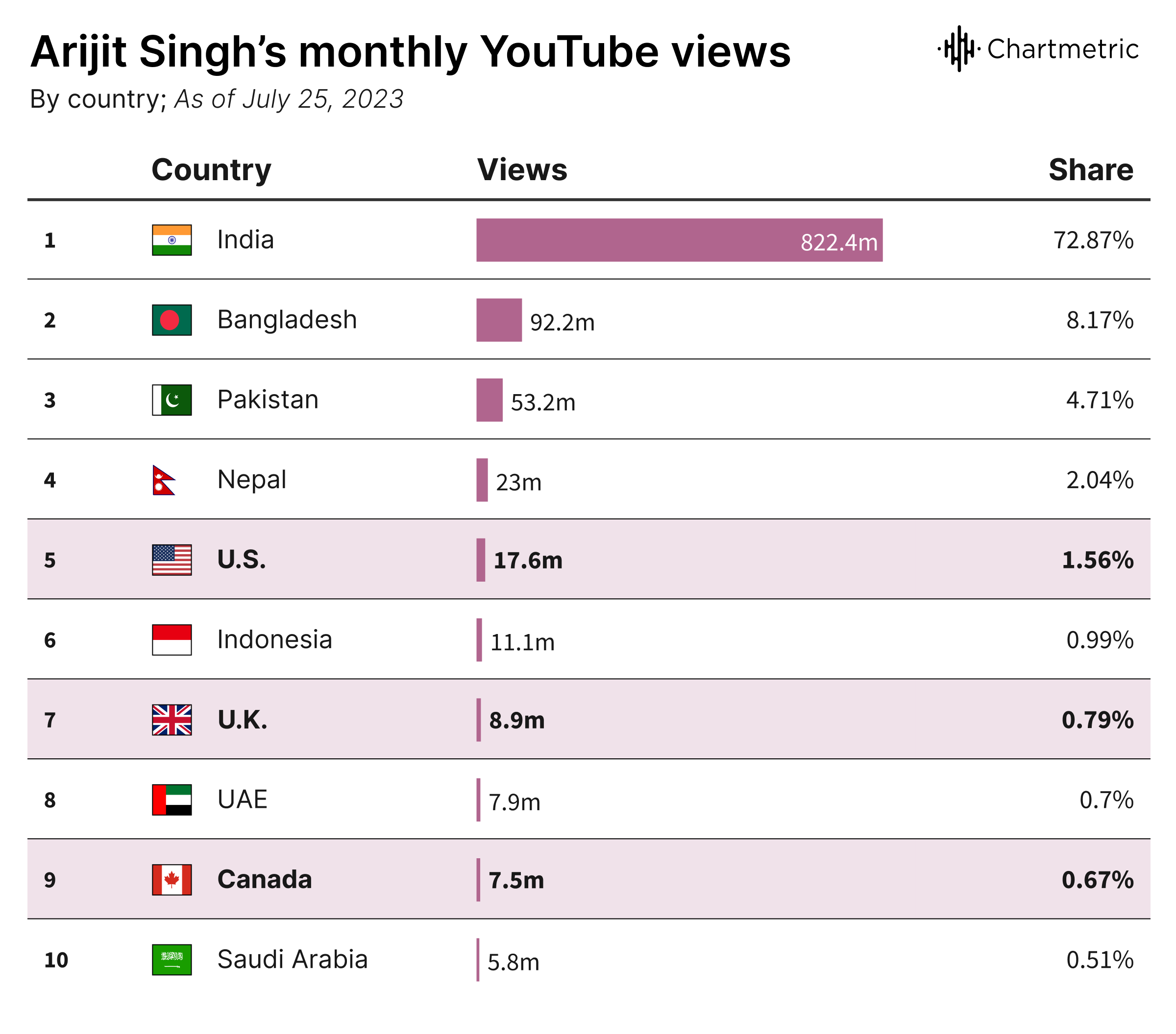 Arijit’s success among the South Asian diaspora is evident from the fact that 16.8 million, or nearly half, of his 35.5 million monthly Spotify listeners are from outside of India. With 273.1k monthly listeners, the U.K. is his second-largest Spotify audience. Although the majority of his impressive 1.1 billion monthly YouTube views come from India, a combined 34 million of those views come from the U.S., U.K., and Canada. These countries have large South Asian diasporic populations – approximately five million each in the U.S. and the U.K. (though the latter is of the entire Asian diaspora) and 2.5 million in Canada – and seem to be strong contributors to Arijit’s global popularity.