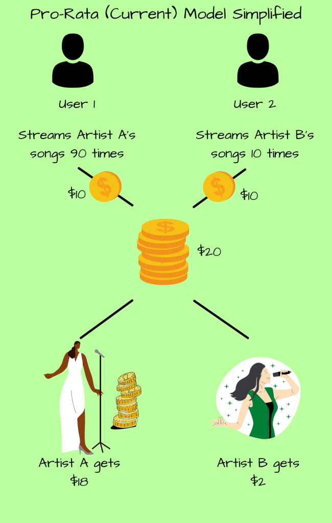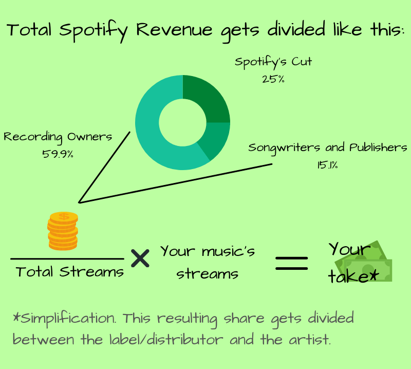 Now let’s get into it. The deal is that Spotify pays 75% of their total revenue to songwriters, publishers, and sound recording owners. 15.1% goes to songwriters and publishers, and the other 59.9% going to sound recording owners. The way they distribute these royalties is by adding up the total amount of streams and dividing it by the percentage of the revenue they agreed to pay out, resulting in a payment per-stream. This amount is then multiplied by the times a specific recording has been streamed and pays that amount to the corresponding party. This is called the “pro-rata” model.