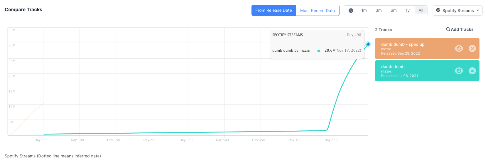 Take Virgin Music artist mazie, for example. In July 2021, she released the track “dumb dumb,” which barely broke 1M Spotify streams by July 2022. Once she released the sped up version, “dumb dumb – sped up,” in September 2022, the original version gained 29M streams in just two months. The sped up version itself already has more than 10M streams. In other words, capitalizing on the TikTok-fueled Nightcore trend helped mazie’s song go from 1.6M streams to more than 40M streams in less than 60 days.