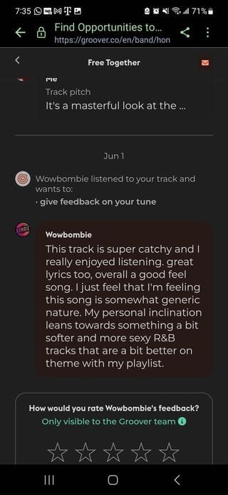 “Using Groover was informative and fun to see the reactions of tastemakers around the globe. They were thorough, and although I didn’t agree with all their feedback, I was happy that they weren’t faking the funk for the Groovies. My songs were shared a bunch of times by some quality DJs. Though it didn’t drive 1000s of people to my single, it was good to get some quotes to describe my music. Not sure if I’ll use it again, but I wasn’t mad at the results.”