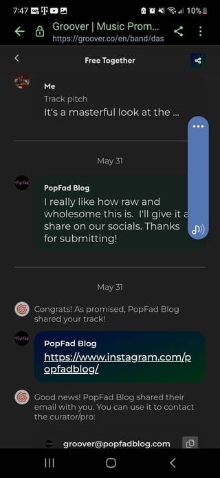 “We spent 100 Groovies and were focusing on playlist curators, hoping to drive this track up into our Top 5 songs list on Spotify. The campaign worked very well.The results were amazing: Over 50% of curators we pitched to shared our song! It got us exactly the activity we were looking for.”