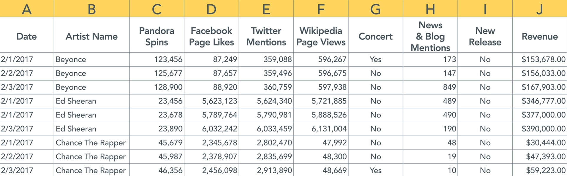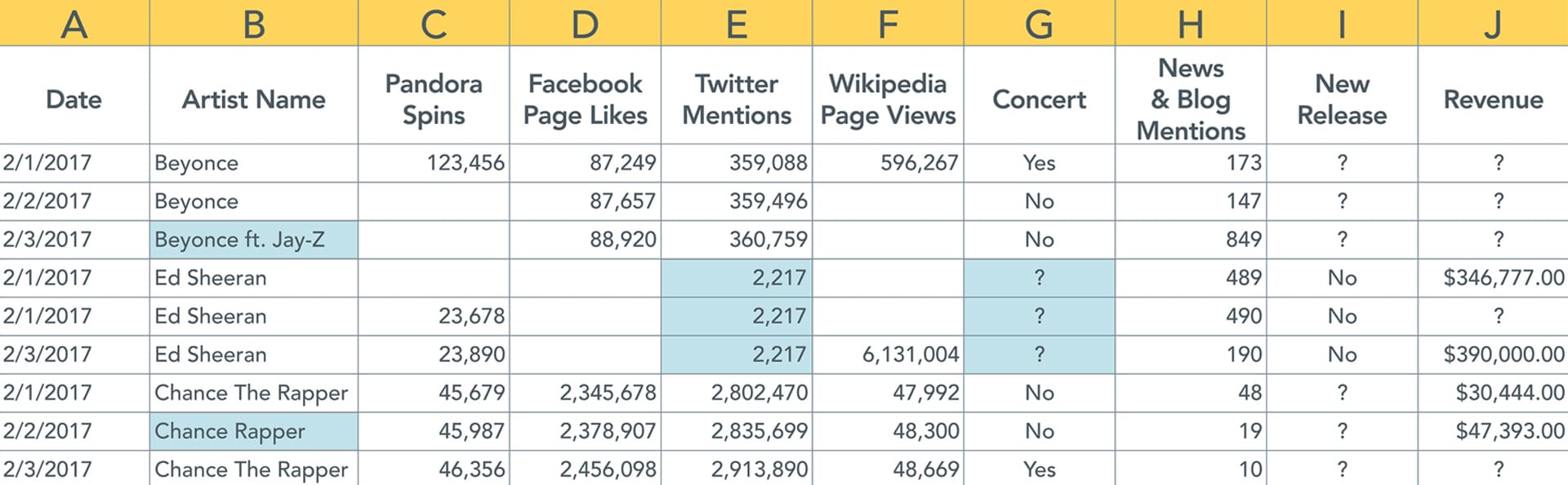- Looking at a data set we will often find unpopulated cells. Assuming we are collecting data daily, one reason for this could simply be that not all artists are seeing activity every day.