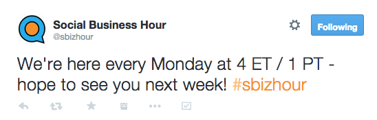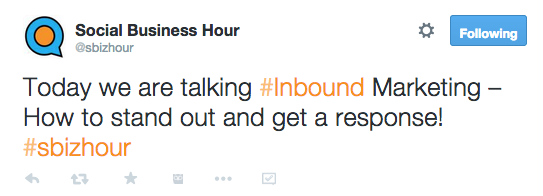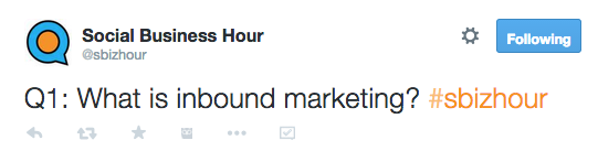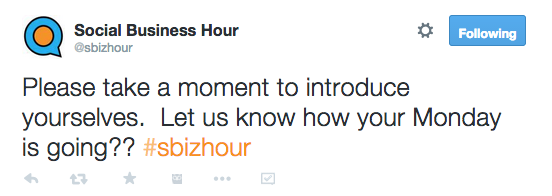 You’ve planned and planned, now it’s time to launch. Assuming you didn’t skimp through the points above, you’ve probably got at least a few people tuned in at the proper time, with the hashtag ready to go.Since you’ve planned your content in advance, your first step will be to kick off the chat with a welcome Tweet that introduces the chat and sets the tone. (All examples from #SBizHour)
