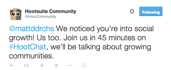 With all due respect to Ray Kinsella “If you build it, they will come” doesn’t apply here. You’re going to have to promote your chat (at least initially) in order to drive participation. Start by scheduling promotional Tweets from relevant Twitter handles at different times of the day, as well as snippets of content from your first chat.If you’re fortunate enough to have nurtured relationships with your brand advocates and ambassadors, inviting them to participate and help spread the word is a natural fit. It’s likely your chat topic will resonate with them, and involvement prior to launch will build a feeling of exclusivity, deepening your relationship with your advocates. We use influitive, an advocate marketing software platform, that helps communicate easily with our #HootAmb family, and to gamify the advocate experience with “challenges” such as promoting or participating in Twitter chats.Promoting your chat with content can also be a smart strategy for building an audience without over-promoting (surprise, there’s a plug at the end of this blog for #HootChat, launching May 14th at 12PST). Aligning your content strategy with your chat strategy can create a powerful one-two punch. Is next week’s blog topic “How to choose images for social media”? Theme that week’s Twitter chat around the visual elements in social media. Or vice versa.Through participation in other chats, it’s also likely that you also ran across connections who would enjoy participating in your chat. We recommend building a list of invitations, and sending each of them a Tweet invitation prior to the chat starting (an hour or so beforehand seems to work well). Make sure though, that your invitations are unique and personalized. If you simply @mention each person with the same message, you’ll be perceived as a spammer and your invitation will have the reverse effect. Craft your messages in a way that makes the receiver feel as though you’re authentically inviting them to your chat.