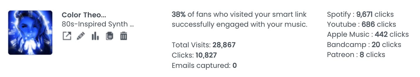 184 listeners x 4.95 streams per listener = 911 streams. Spoiler alert, the 7.61% intent rate is dismal compared to my other campaigns.