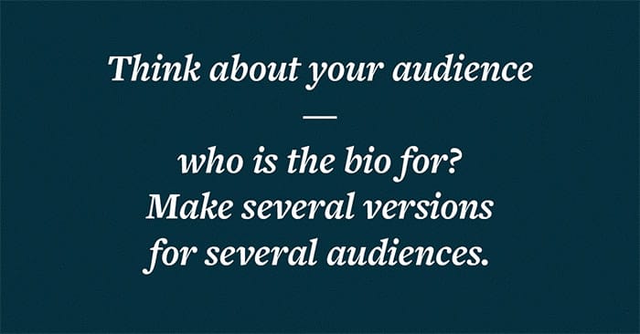 Don’t write bios that are too long. If it’s for an award ceremony or a festival website, give them 1-2 paragraphs, less than 200 words. If it’s for industry people, get everything into 3-4 paragraphs—under 400 words.