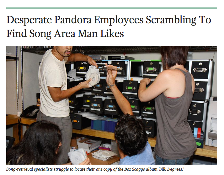 The Onion, 2010This conversation reminds me of The Onion article about human curators from 2010, “Desperate Pandora Employees Scrambling To Find Song Area Man Likes.” It was a joke back then, but could ring true today. Did you ever see that?It’s funny because that is something that we’ve talked about internally, whether someday we could get to the point where the consumer approaches a service like Mixcloud and says, “I am doing this barbecue, can you create me a custom mix or playlist from scratch?” I think there is possibly a business around that, in which the curator could get paid in a one-to-one transaction. I think that is something we could definitely be looking at in the future.What happens when we are all able to access these streaming services from a screen on your car stereo? Where does satellite radio fit into that mix?When we start to see 4G nearly everywhere, which is kind of the case now — the delivery of radio or audio streaming doesn’t make economic sense to do it via satellite, because they are incredibly expensive. If you are new car owner, and it’s a question of paying $20 or $30 per month for satellite radio, versus $10 for Spotify, or maybe $5 for a premium Mixcloud account. At that point, it’s just a question of economics. I’d be fairly worried if I was in Sirius XM’s shoes, because I don’t know how much longer the satellite radio model is going to be workable for.I guess what remains to be seen is, how much goes into the actual car dashboard unit and how much of actually goes to your phone. My gut instinct is that there are so many different car manufacturers out there. Apple are doing their CarPlay thing, Google are trying to do something, Ford had their own system. We’ve been approached by all of them, pretty much, and it’s kind of a nightmare to build something that works with everyone. I think if you focus on the phone as the interaction device and somehow it streams to the dashboard, then that just makes a lot more sense and is a lot more scalable in the long term.