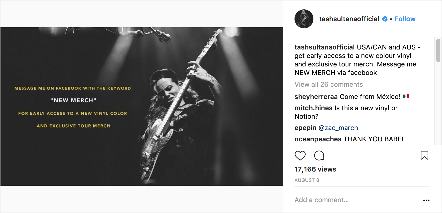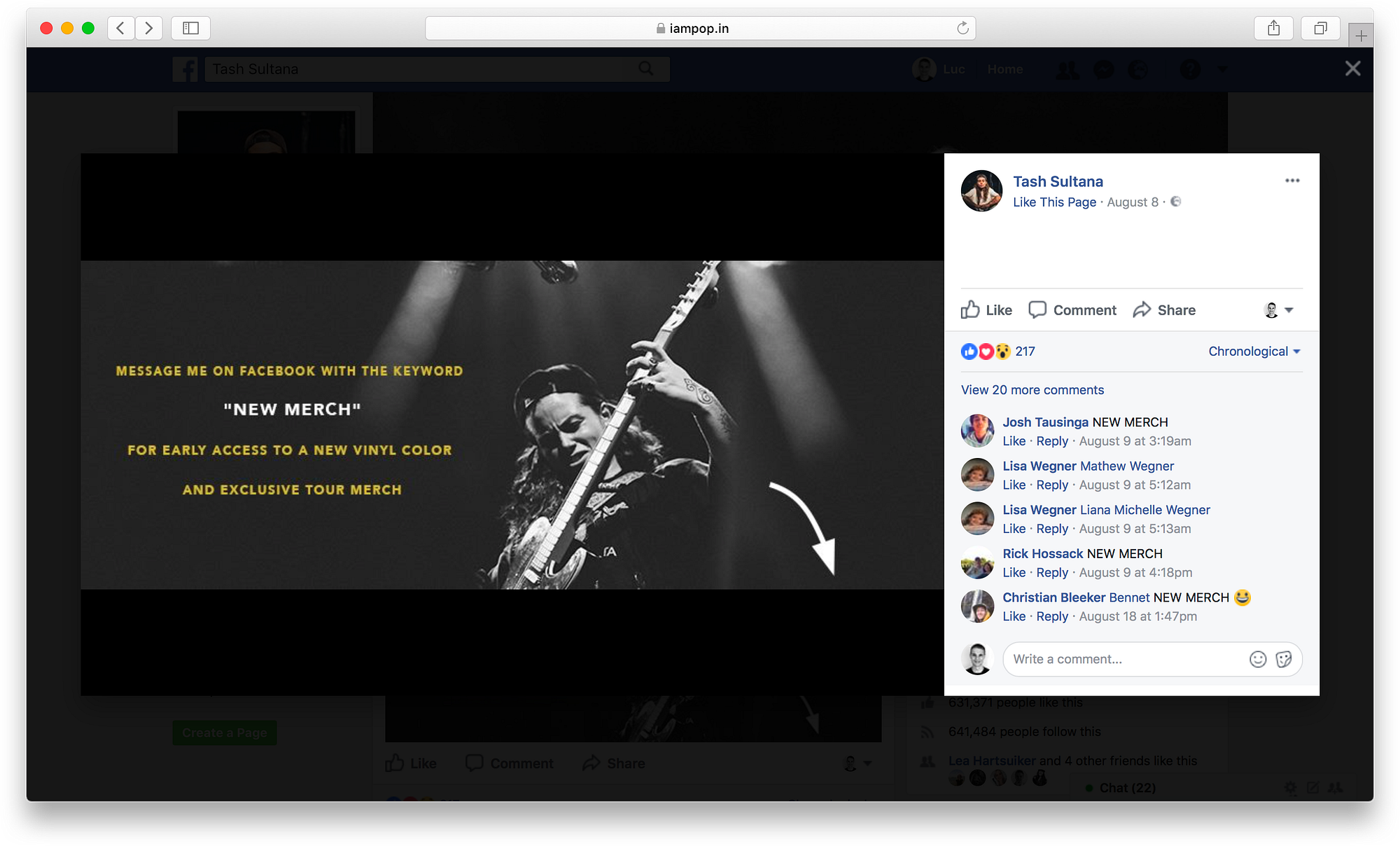 Another smart way to get fans to notice you have a Messenger bot is by creating a cover image for your FB page with a strong CTA to urge them to click on that “Send Message” button.Next to that, make it juicy; give them an incentive to check out your bot- mention you’ll be sharing exclusive content on there — something they won’t be able to find anywhere else or that they can unlock exclusive merch or other rewards. Like, a behind the scenes sneak peek from your latest tour.The thing is, not only is the cover image impossible to miss, but also people’s fingers will be itching to check out that exclusive content you promised them. For some inspiration, check out Tash Sultana’s example below.
