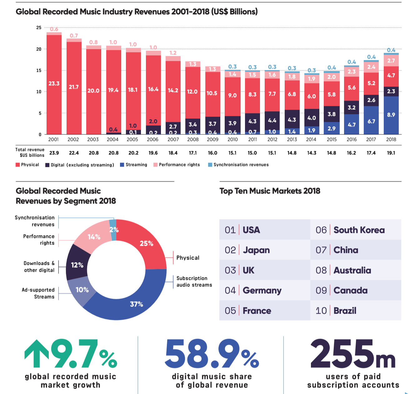 After all these years I’m still alive”“I Believe in Miracles” from Brain Drain, 1989What better words could apply to today’s music business? Bruised and beaten by peer-to-peer piracy and the unbundling of the album—single tracks for sale—labels are currently in their fifth-straight year of growth. Global revenues in 2018 were the highest since 2007—without adjusting for inflation—and, I think it’s safe to say, will grow to over $20 billion this year.Maybe “miracle” is too strong a word to describe the canary’s escape from the coal mine, so to speak. People throughout the industry understand a four-year upswing doesn’t make a recovery. Hurdles still exist: licensing new business models; implementing aspects of the Music Modernization Act; figuring out what to do with smart speakers; etc. etc. etc.But a turnaround is in progress. Since Napster launched in 1999, the music industry was “All Screwed Up” (Brain Drain, 1989) and probably felt like a “Teenage Lobotomy” (Rocket to Russia, 1977). But everyone—labels, publishers, managers, artists, digital service providers—figured out how to run a digital business, rejected any urge to say the Internet will be the “ Death of Me” (Halfway to Sanity), all the while telling itself “It’s Gonna Be Alright” (Mondo Bizarro, 1991).Glenn Campbell: I write. I do numbers. I write about numbers. Working in and around the music business for a few decades.