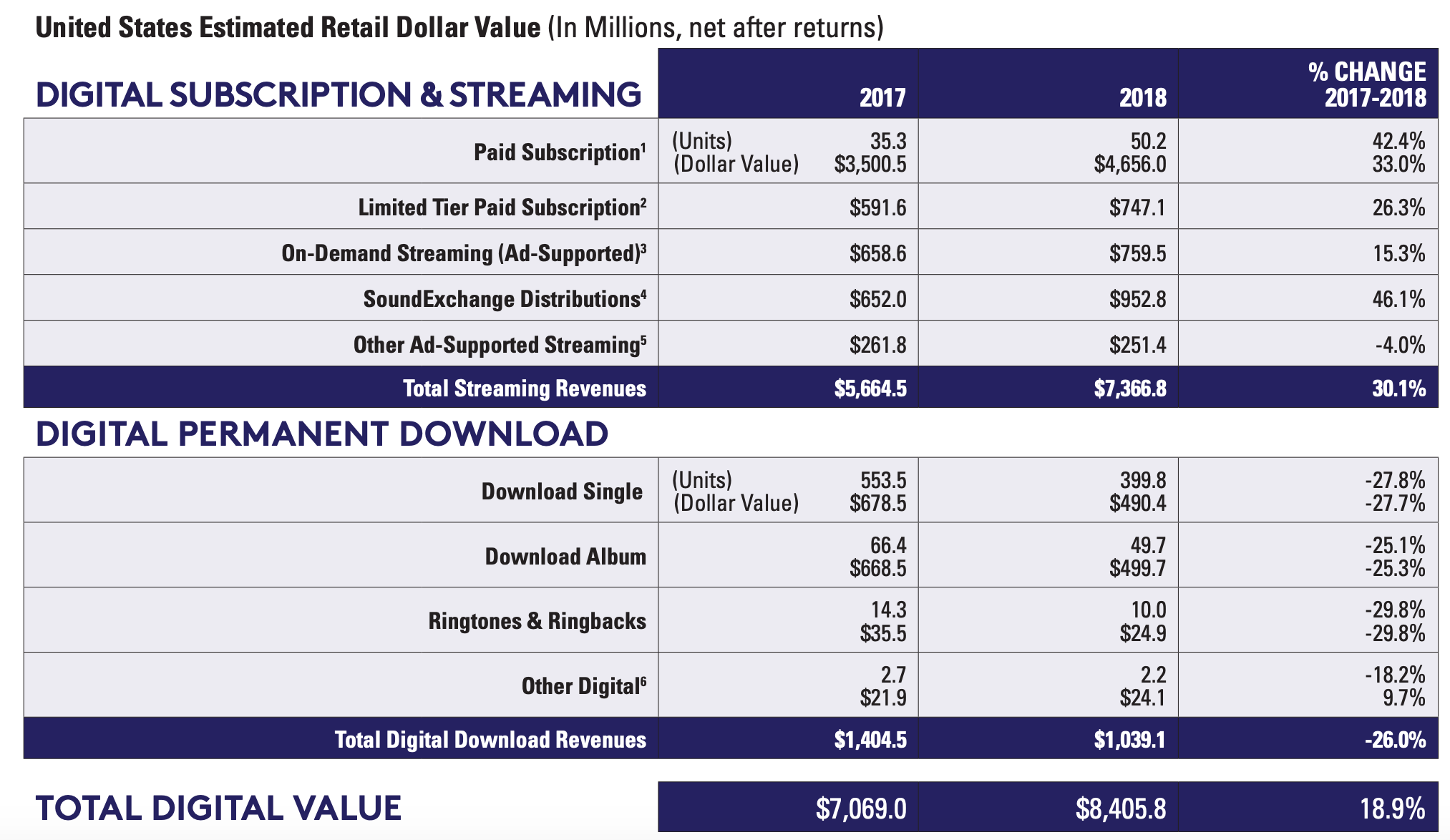 Glad to see you go, go, go, go, goodbye”“Glad to See You Go” from Leave Home, 1977“Glad to See You Go” lyrics read like a slasher horror film — typical for the band:“Going to smile, I’m gonna laughyou’re going to get a blood bathand in a moment of passionget the glory like Charles Manson.”Indeed, the digital download is in a bloodbath right now.Global digital download sales plummeted 21.2 percent and accounted for just 12 percent of total revenues in 2018, according to the IFPI.Sales are falling faster in the United States: in terms of both units and revenue, downloads fell between 25 and 28 percent last year.The download had a good run. If you start with Napster and continue through iTunes, the download has had a solid 20-year run. Downloads were a necessary stepping stone between physical items and cloud computing.But I can barely be bothered to download a track these days. I don’t even download the digital tracks that come with my purchases on Bandcamp. Instead, I stream the songs within the Bandcamp app knowing I can download the tracks if/when I choose. But I can’t be bothered.Oh, how we were wrong about digital downloads. A decade or more ago, many learned people in the music business pondered a future where a small, portable device had enough memory to hold thousands of albums and hundreds of millions of tracks. (Call it Jobs’ Law.) Streaming services existed but mass adoption was an abstract event too far in the future.A combination of (then rampant) peer-to-peer distribution and large-capacity storage devices was frightening. “Who would bother to buy music?” they thought. You couldn’t swing a dead cat at a music business conference and not run into a panel on how teens of the ’00s were a generation lost to piracy. Occasionally a panel would have actual teens talking about how they listen to music. The middle-aged audience listened with both awe and fear. It was a fair question, though, and it presaged today’s unlimited access to music.Fast forward a decade. Streaming services create far more value than piracy can offer. A few hundred million people pay some amount of money ($10/month here, more in some places, less in some places) to rent rather than own. Many people have moved beyond the download and prefer the access model over ownership model. (Video streaming services such as iTunes and Amazon make renting superior to owning.) The resurgence of vinyl LPs is not incongruous to consumers’ shift to streaming; people occasionally buy, but, by and large, they’d rather not buy.Downloads have value in a few scenarios. If you lose a cell signal and haven’t downloaded songs from your streaming service, you’re out of luck. (Premium streaming services offer downloads to mobile.) A download works as long as your device has power. And if you’re still into downloads, you can fit a LOT onto today’s thumb drives. If your car stereo has a USB input, for example, you can take your music collection—it may include concert bootlegs, unlicensed recordings, and DIY remixes not found on streaming services—on the road.And that lost generation? They’re now the 25–34 demo—the age group with the highest adoption rates of paid streaming. Not so lost after all.