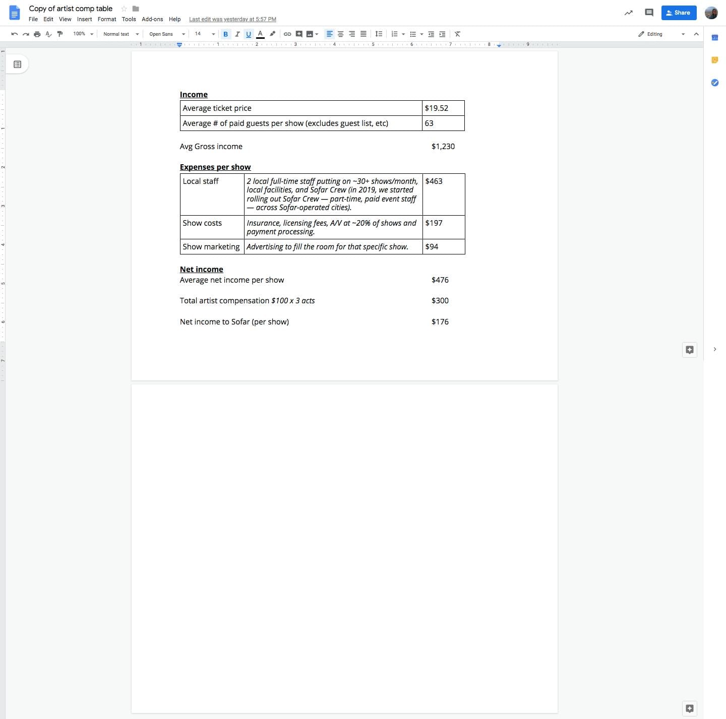 He then offered this income breakdown of a typical Sofar show that charges a fixed ticket: