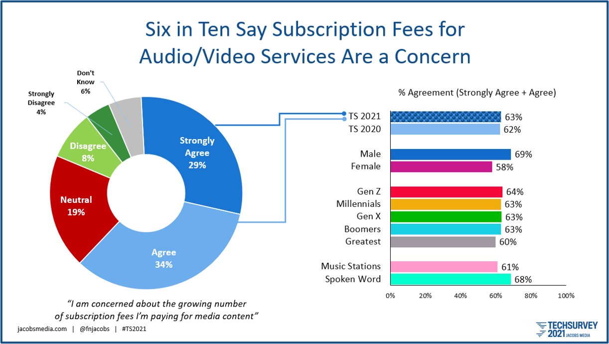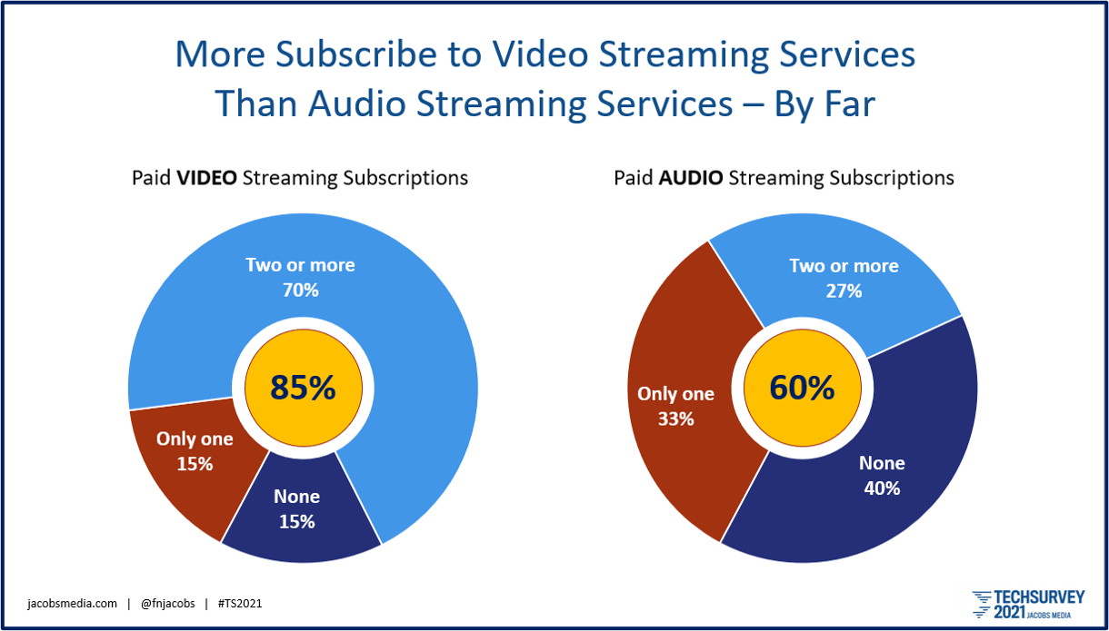 Overall, 60% of the 42,000 core radio subscribers who answered Techsurvey 2021 pay to subscribe to a music service like Spotify, Pandora, or Apple Music.