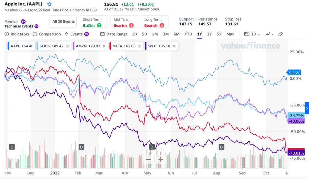 And speaking of downturn, you may have noticed that Big Tech companies that are dependent on advertising revenue have been getting crushed in the current recession. Their crushing is illustrated in the chart above comparing Google, Amazon, Meta and Spotify to Apple. One reason the smart people are getting crushed is that in a recession, businesses cut back on advertising. So if your business depends on advertising….You know, ad revenue, the part of their business you have absolutely no control over and that they won’t let you upstream audit.