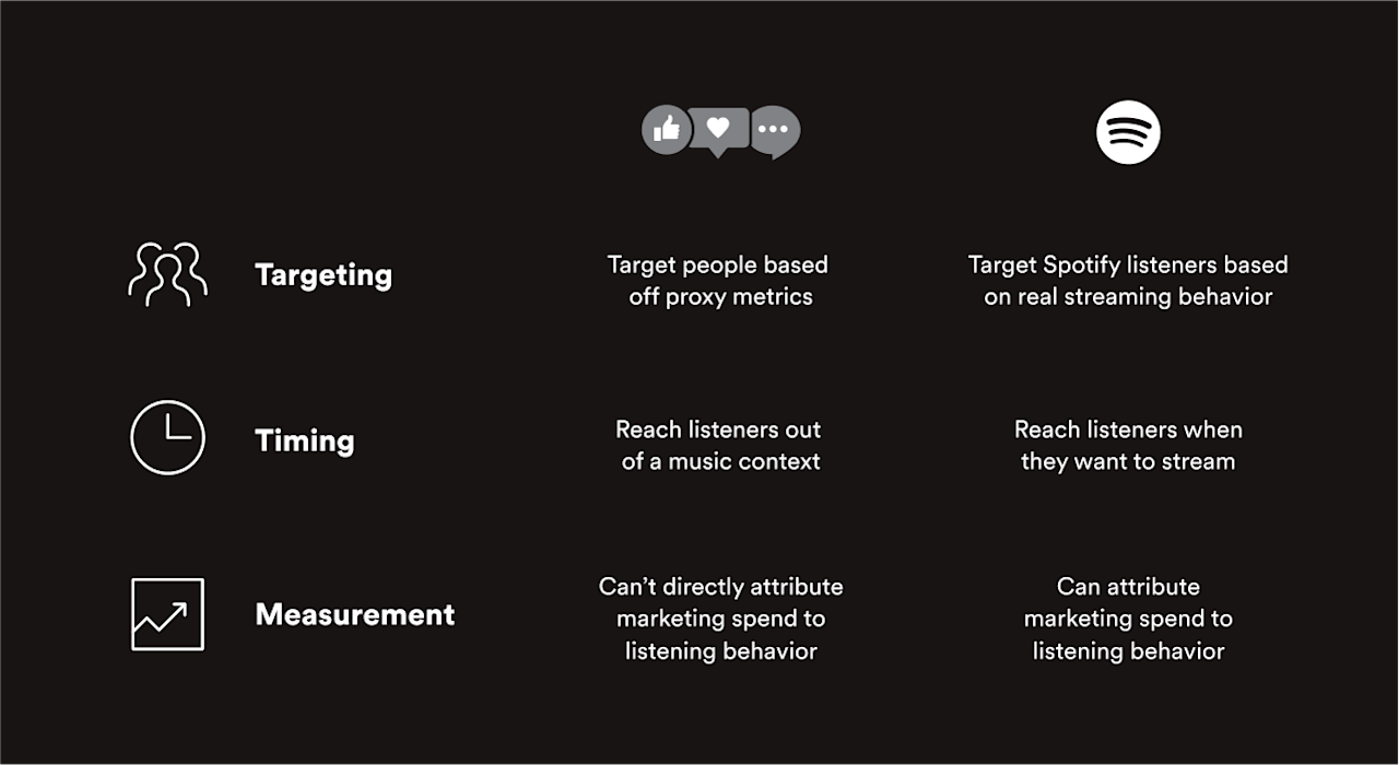 Other factors also likely contributed to the results. “Social ads target listeners based on proxy metrics, making it easy to reach broad audiences, but difficult to be sure you are reaching listeners – especially those listeners who have the potential to become fans,” Spotify argues. “They also reach listeners out of context (while they’re scrolling and reading, next to other ads), not when they’re ready to listen.”