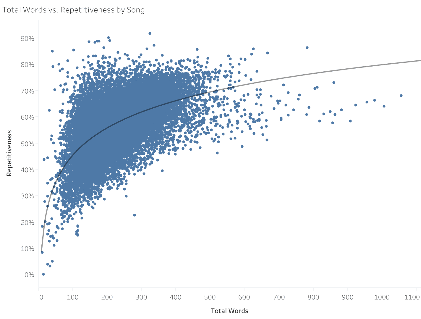 While more repetitiveness in a song is not inherently an indictment of its musical quality, this metric can be used as a proxy for storytelling. The more unique words there are in a song, the more likely a story is being told beyond the repetition of a catchy hook.
