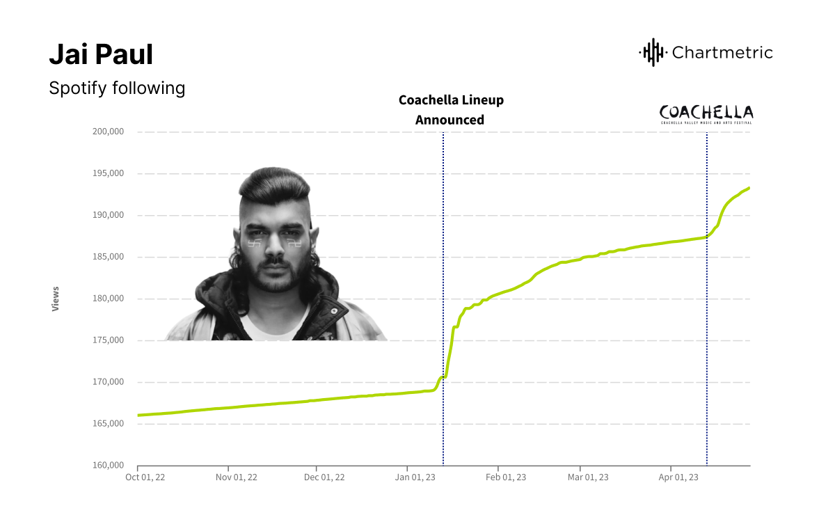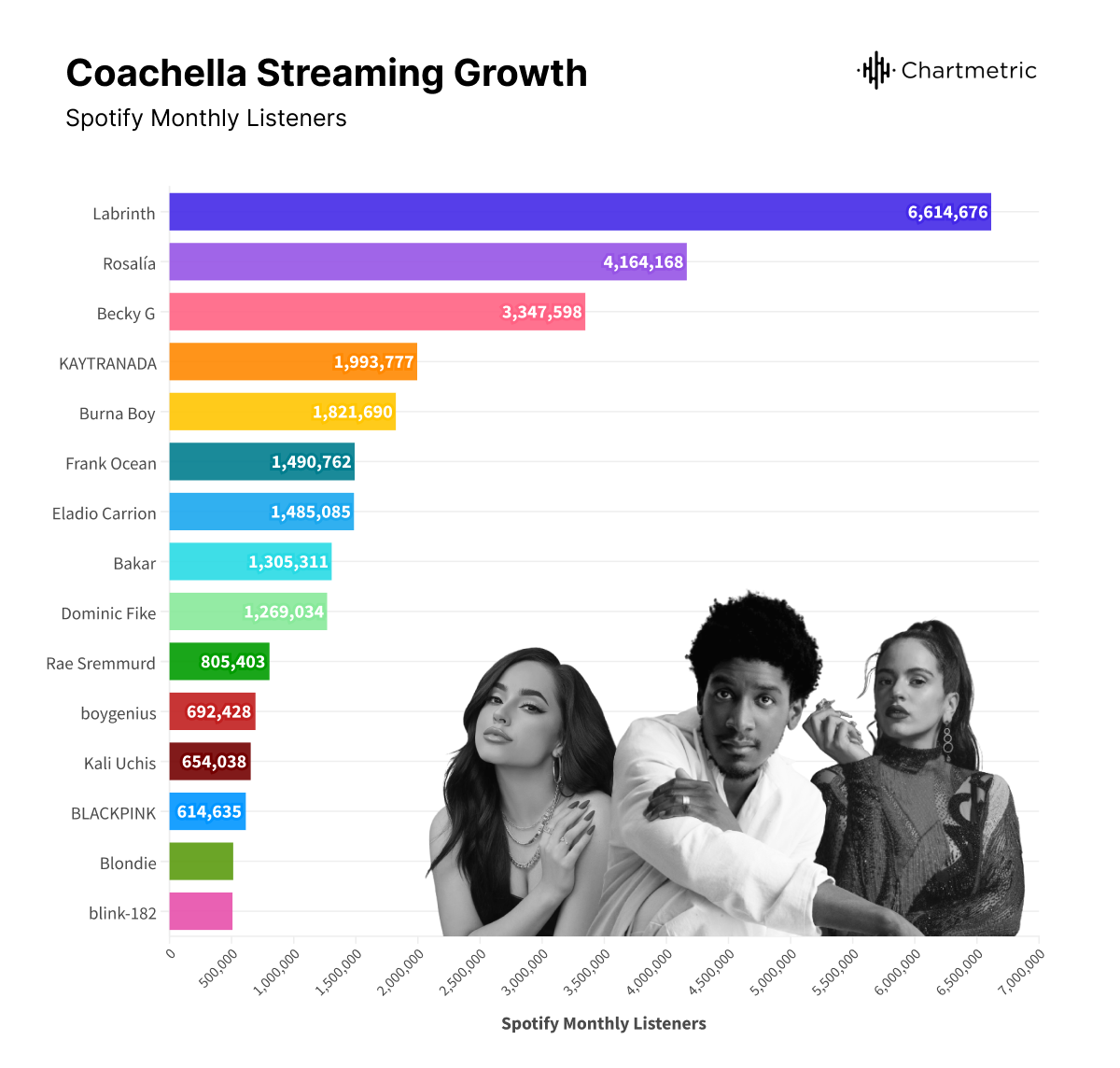 While dozens of performers on 2023’s Coachella roster saw significant boosts in Spotify listeners, such as Afrobeats star Burna Boy (+1.8M) or Latin Pop’s Rosalia (+4.1M), one of the most interesting stories in listening growth occurred months before when the lineup was released.