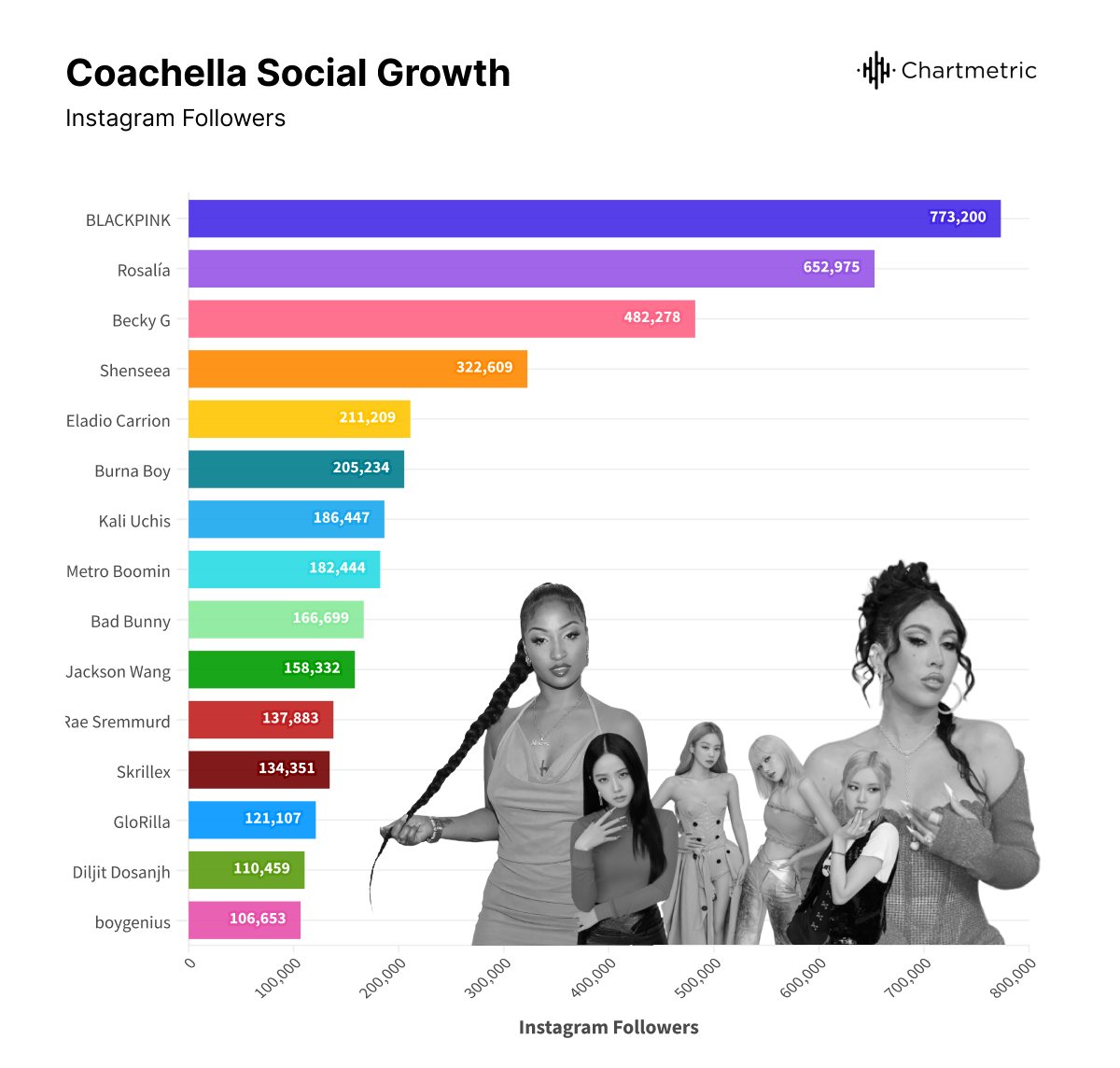 Our highest-growing artist by Instagram following, BLACKPINK, created a historic moment for K-pop, marking the first time a Korean girl group had headlined the renowned festival. The quartet delivered an electrifying set, showcasing their powerful vocals and impressive choreography, earning them critical acclaim and boosting their social following by 700K+ Instagram followers.