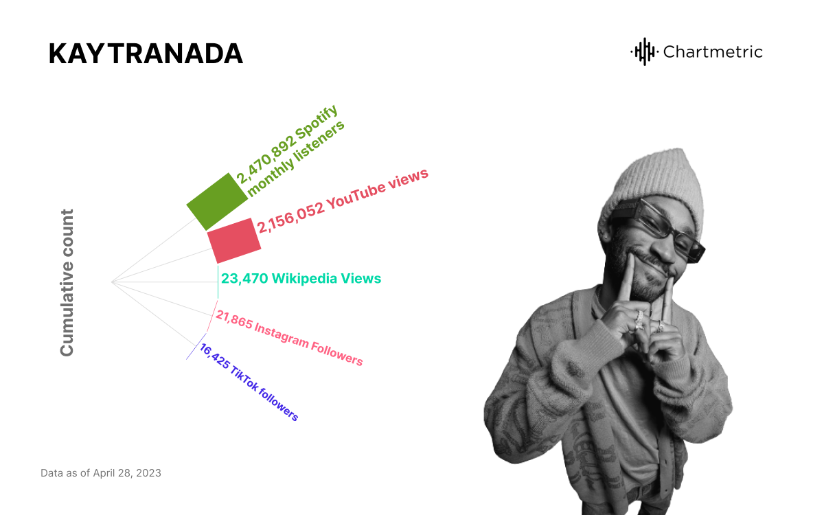 Another stand-out from this year’s lineup was KAYTRANADA, whose performance was a celebration of his unique blend of electronic and hip-hop music. The Canadian DJ and producer brought a high-energy set to the stage, showcasing his exceptional mixing skills and infectious beats. As the crowd danced along to hits like “Glowed Up” and “Lite Spots,” KAYTRANADA also used his slot to debut “KAYTRAMINÉ”, a musical project with rapper Aminé that rolled out at the beginning of April. With both the collaboration and a stellar Coachella performance, KAYTRANADA was able to boost his Spotify listening by nearly 50% (+2.4M), his TikTok following by 12% (+16.4K), as well as garner over 23K Wikipedia page views.