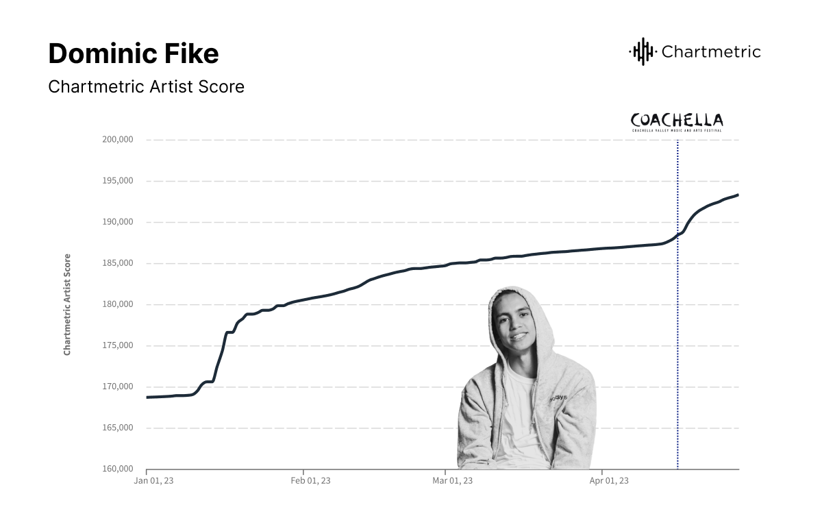 Among our biggest growers, we see Dominic Fike, Labrinth, and Romy in the top three spots. Fike, in particular, had significant growth of over +42K, likely due to his transcending performance and a recent single release, “Dancing In The Courthouse.” In the case of Fike, Labrinth, and several other Coachella performers, it’s clear that timing releases around a Coachella slot can be an extremely effective way to double up on generated traction.