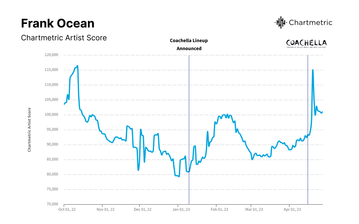 Coachella 2023 was certainly one for the books. Between Frank Ocean’s controversial performance and Bad Bunny’s “accidental” diss to Harry Styles, this year’s festival had fans sitting back with popcorn in hand. But how much did these iconic moments affect the social and streaming stats of your favorite artists? Follow along to see what the data tells us about some of Coachella’s most significant performances.