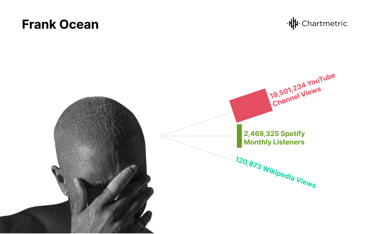 Amongst all the turmoil, the buzz around Frank’s lackadaisical performance still drew fans to listen to his music. In the month of April, Ocean grew his Spotify monthly listeners by +2.4M, his YouTube channel views by +19.5M, and his Wikipedia page views by over 100K.